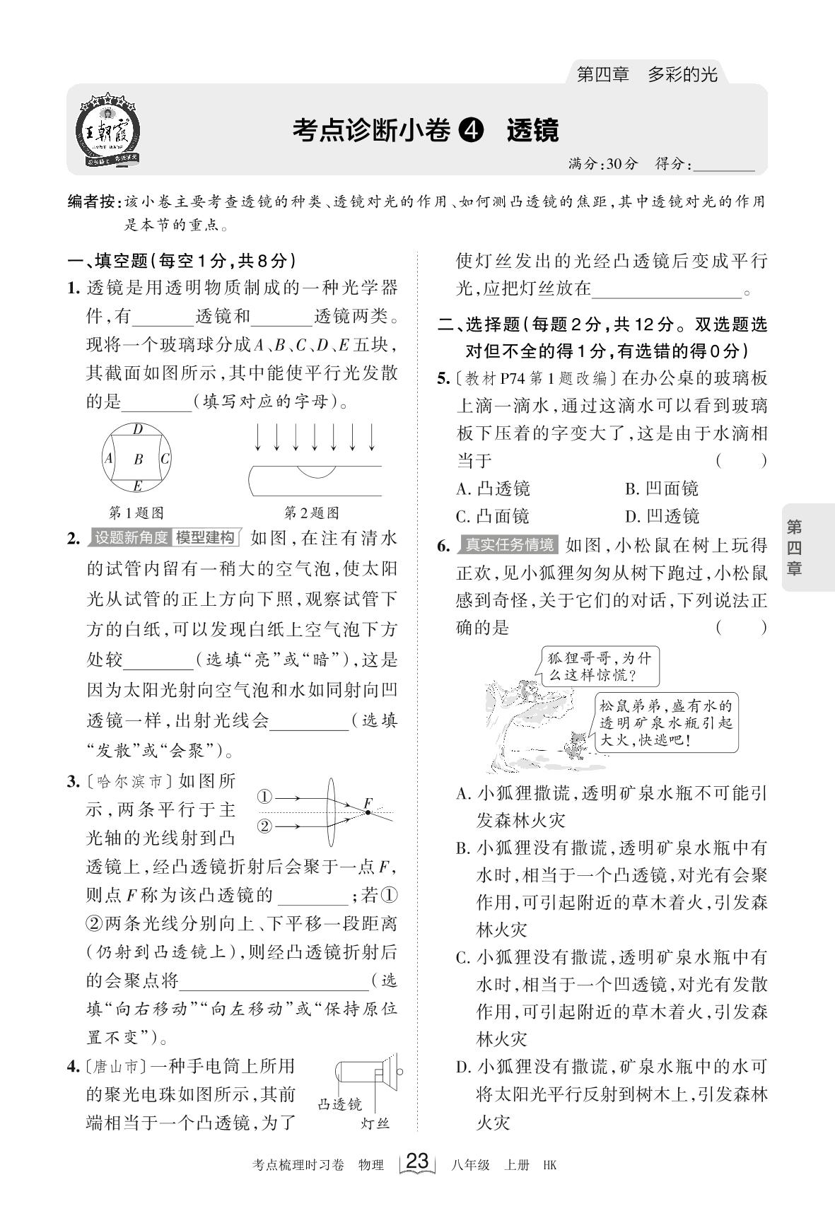 2023上册八年级物理沪科版 第四章 考点诊断小卷4 透镜