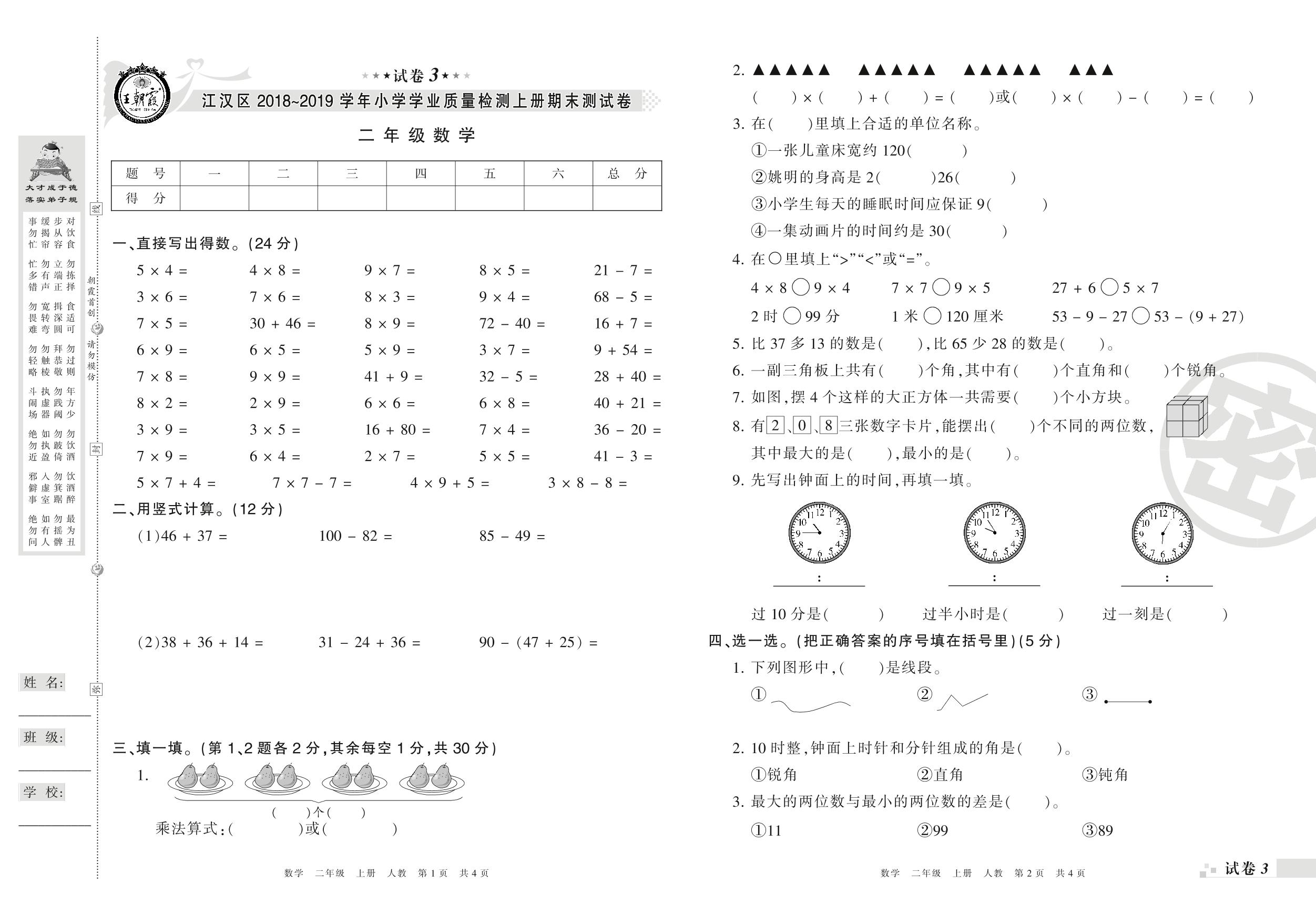 2018-2019学年第一学期武汉市江汉区二年级数学试卷(人教版)【3】