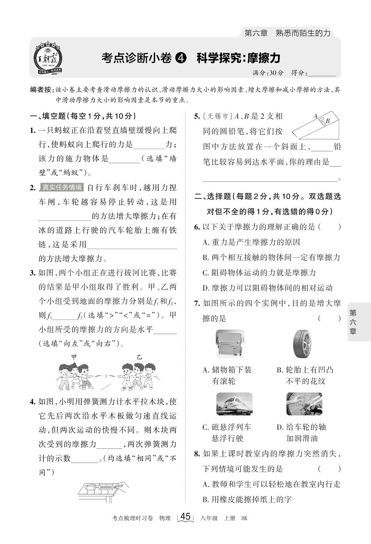 2023上册八年级物理沪科版 第六章 考点诊断小卷4 科学探究:摩擦力