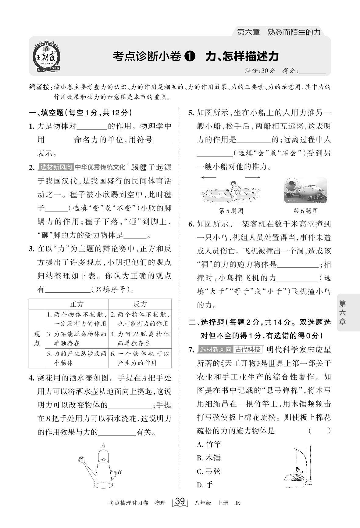 2023上册八年级物理沪科版 第六章 考点诊断小卷1 力、怎样描述力