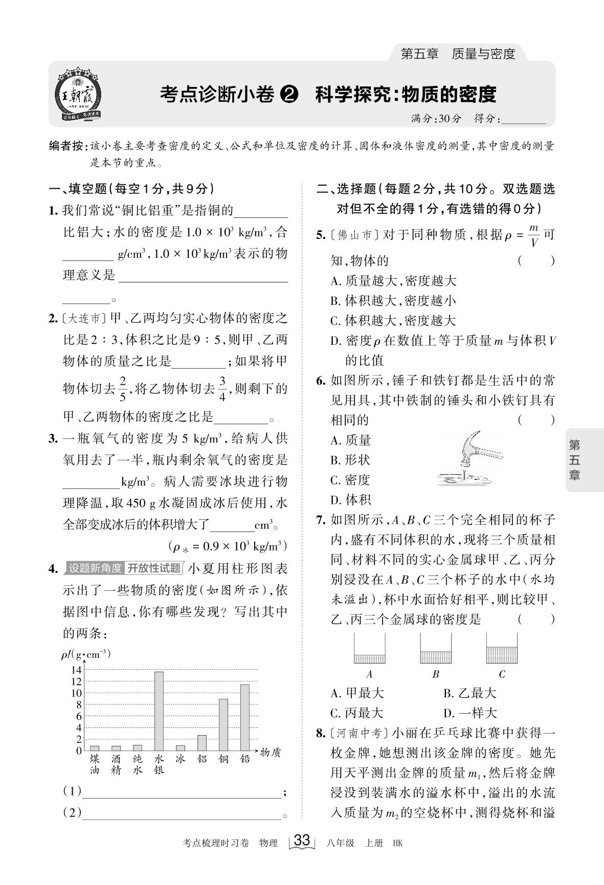 2023上册八年级物理沪科版 第五章 考点诊断小卷2 科学探究:物质的密度