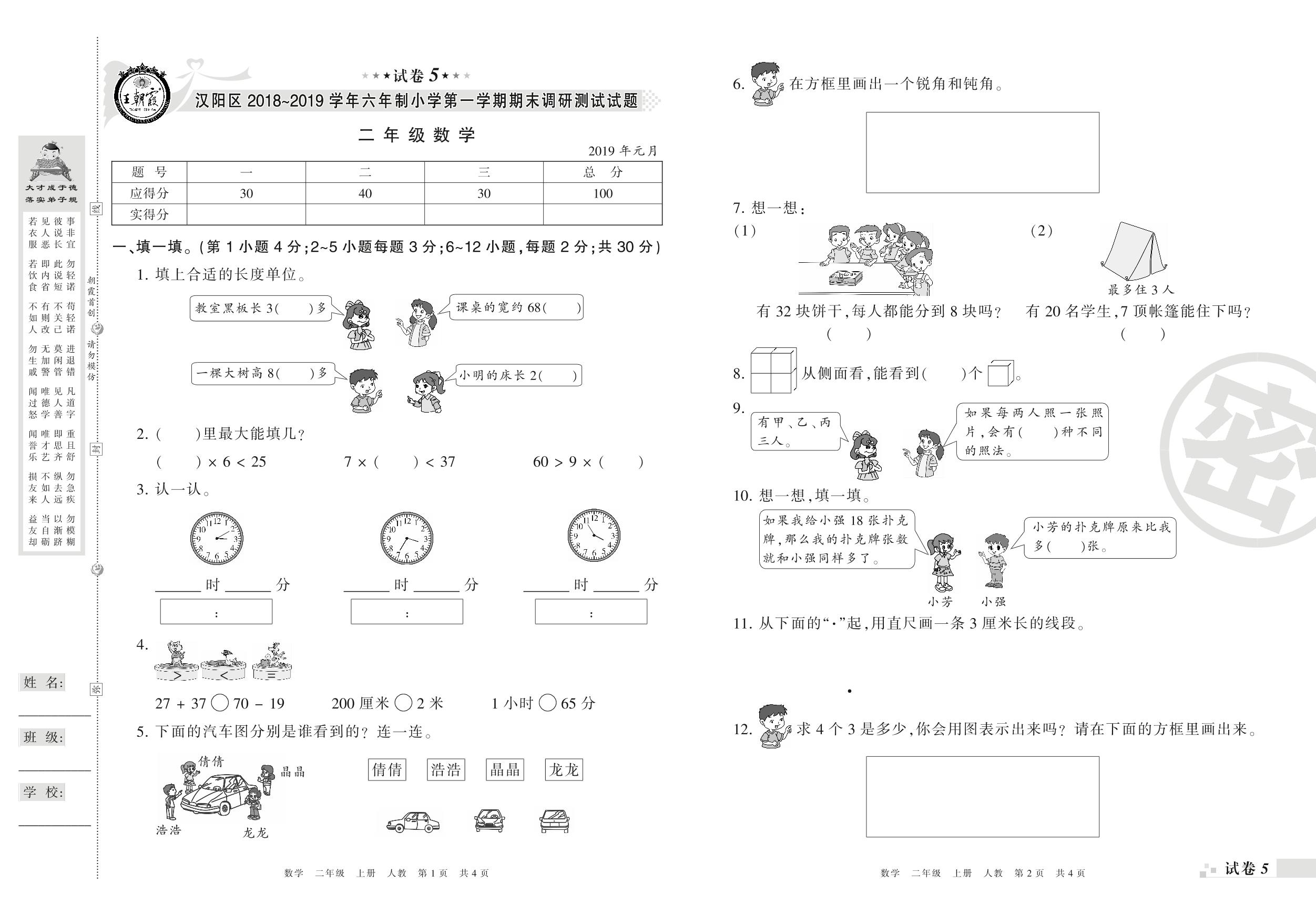 2018-2019学年第一学期武汉市汉阳区二年级数学试卷(人教版)【5】