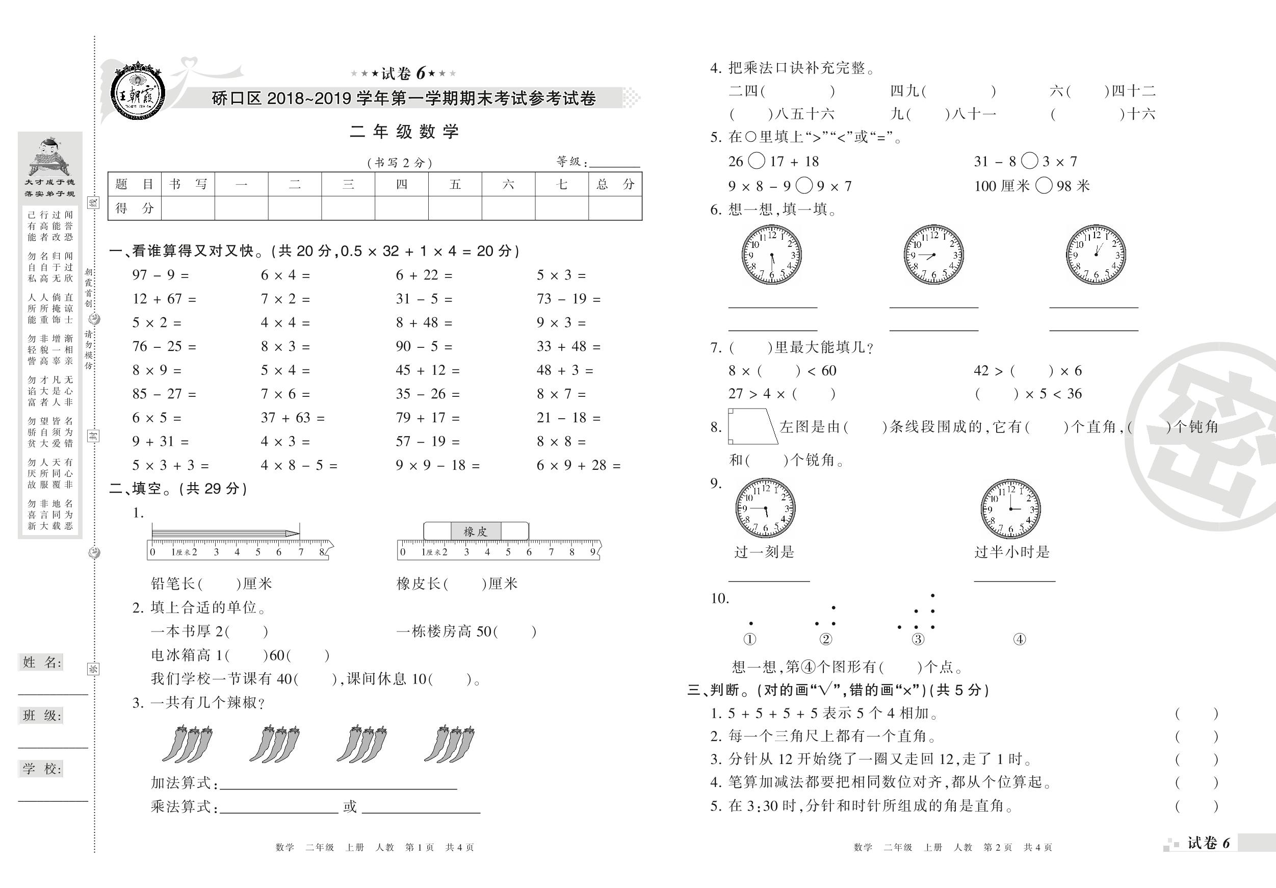 2018-2019学年第一学期武汉市硚口区二年级数学试卷(人教版)【6】
