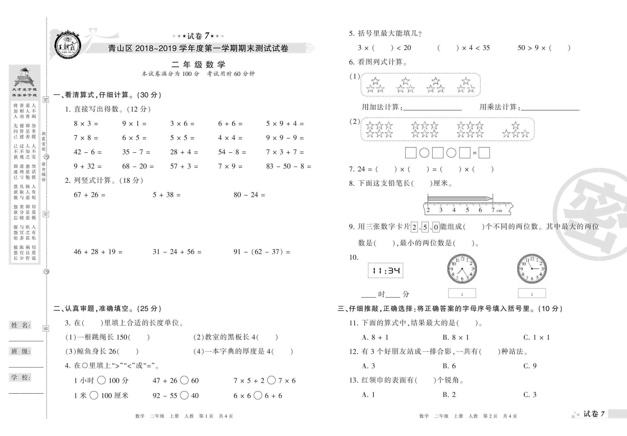 2018-2019学年第一学期武汉市青山区二年级数学试卷(人教版)【7】