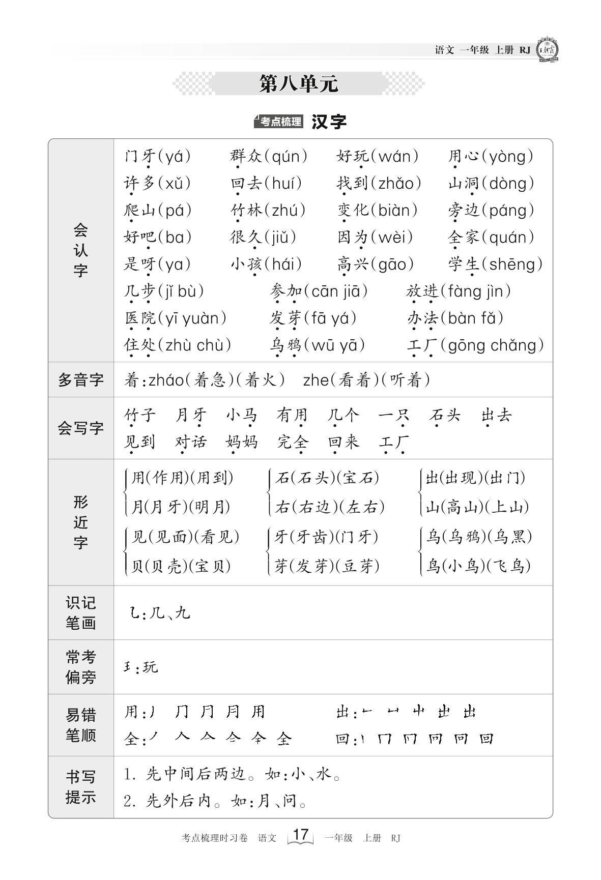 2023上册一年级语文人教版 考点梳理手册——第八单元