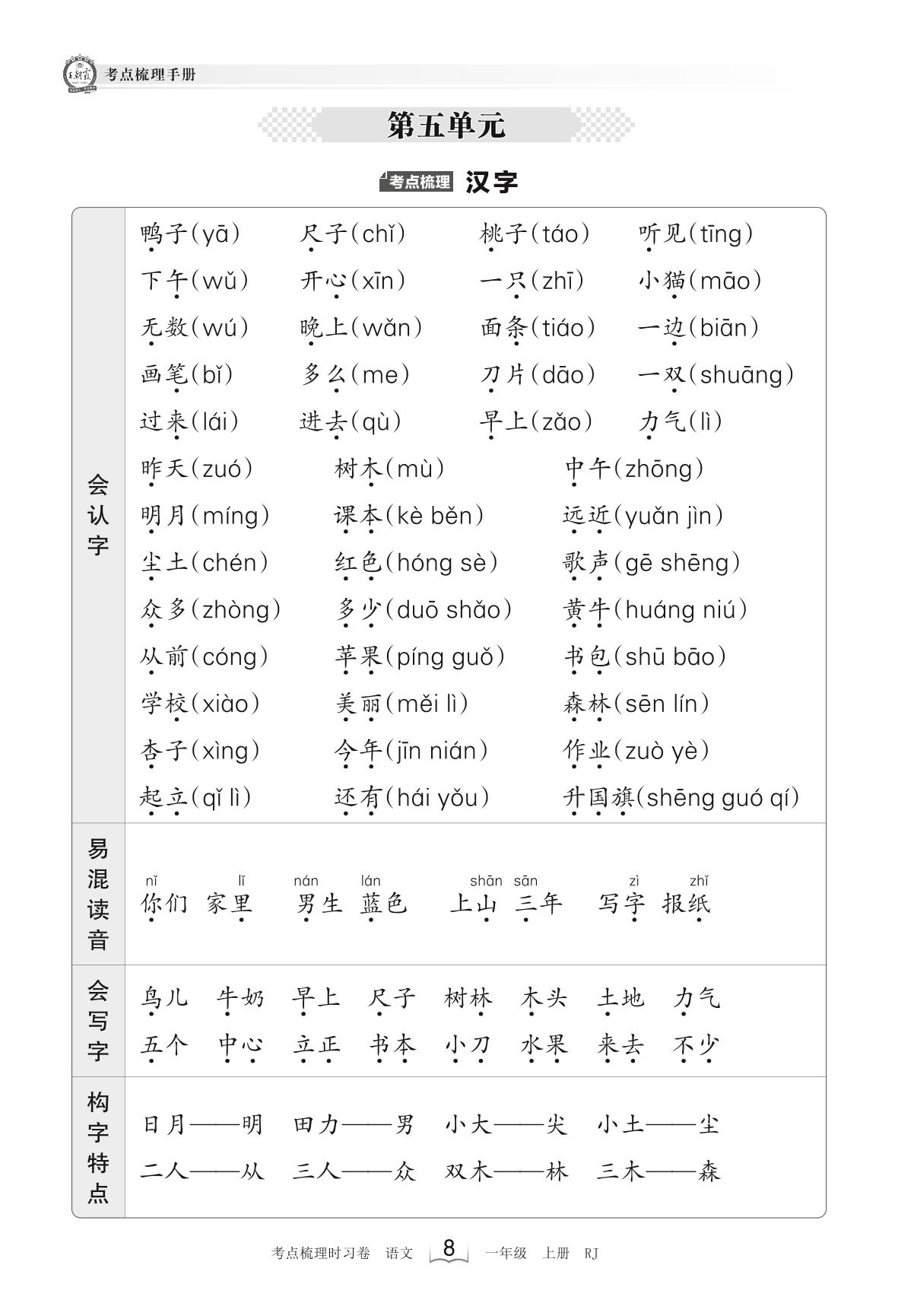2023上册一年级语文人教版 考点梳理手册——第五单元