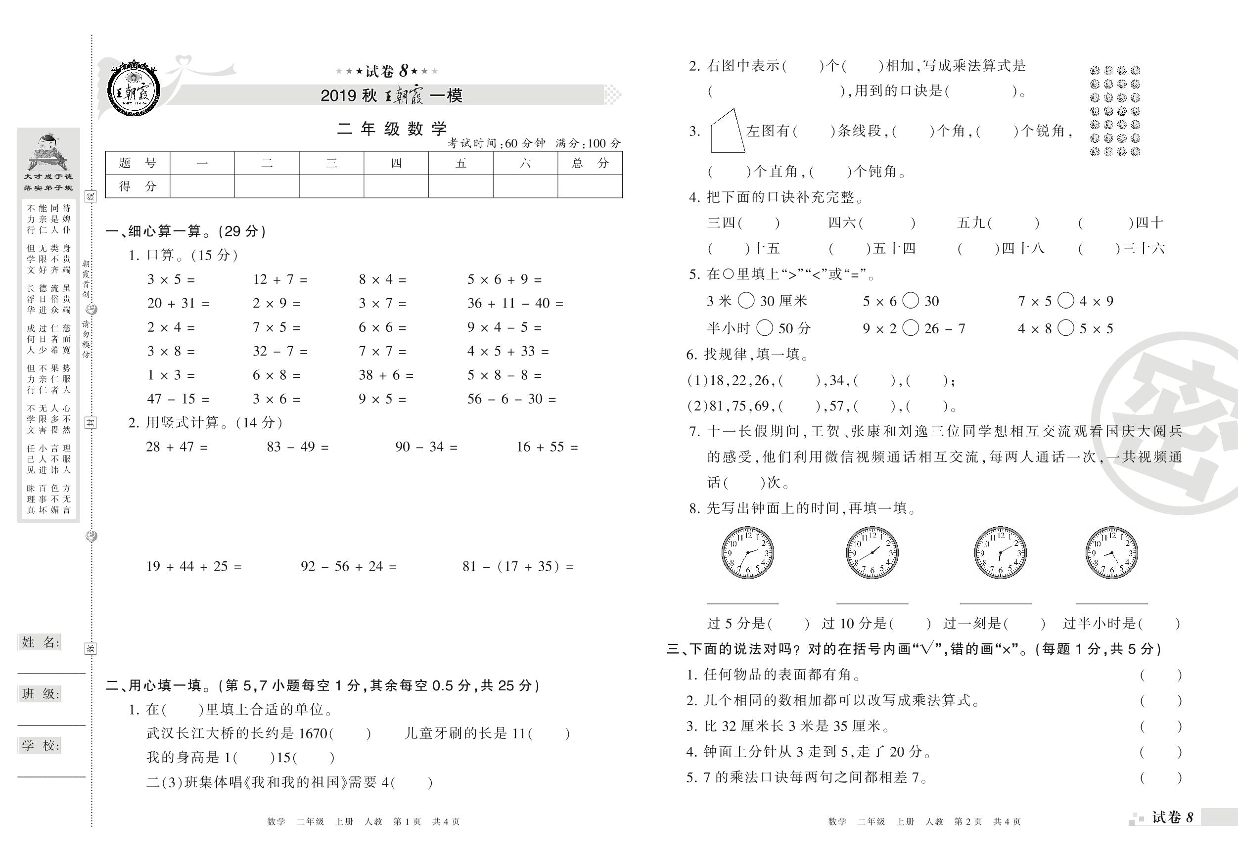 王朝霞期末模拟卷二年级上册数学(人教版)_R21080393052【8】