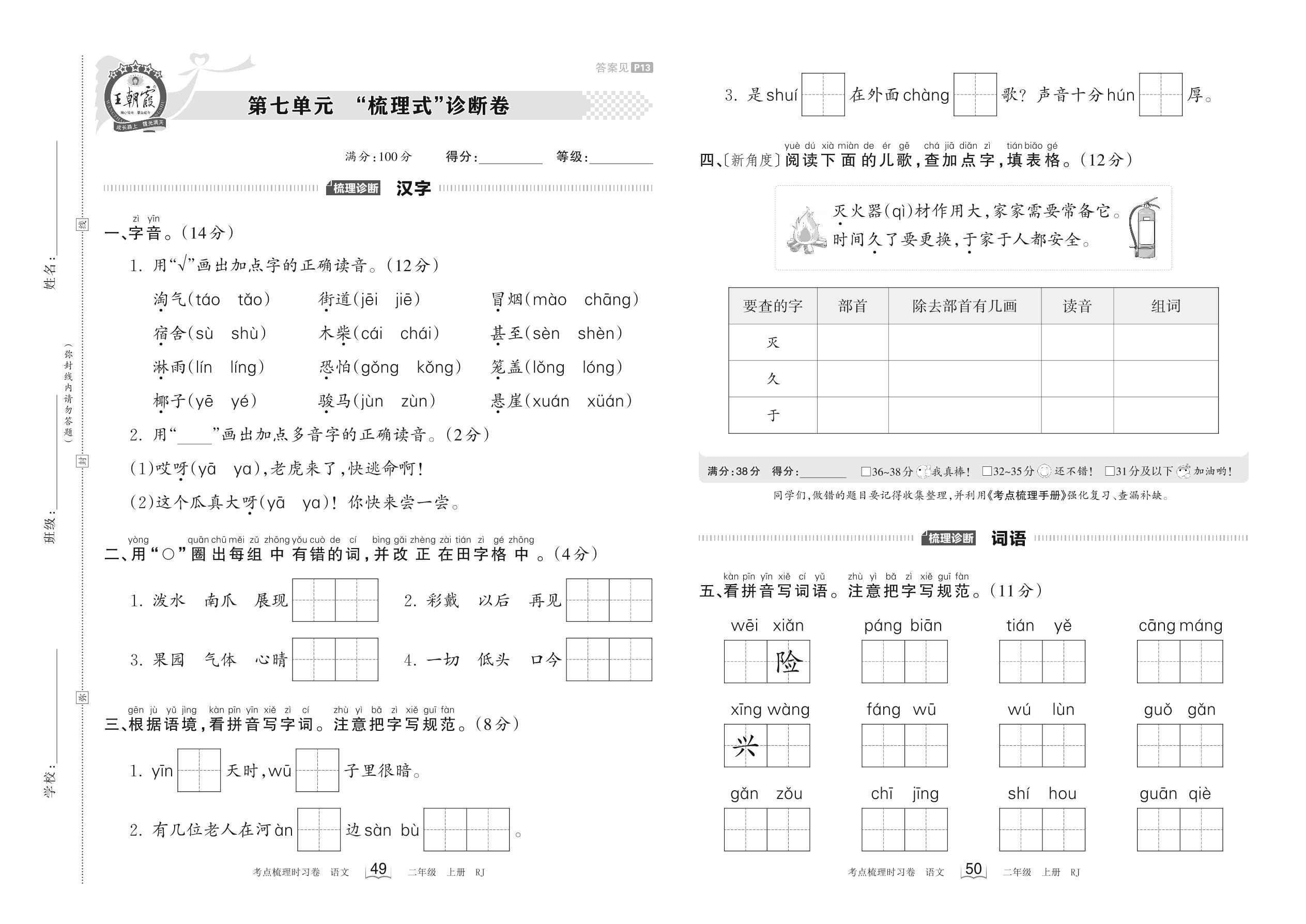 2023上册二年级语文人教版 第七单元 “梳理式”诊断卷