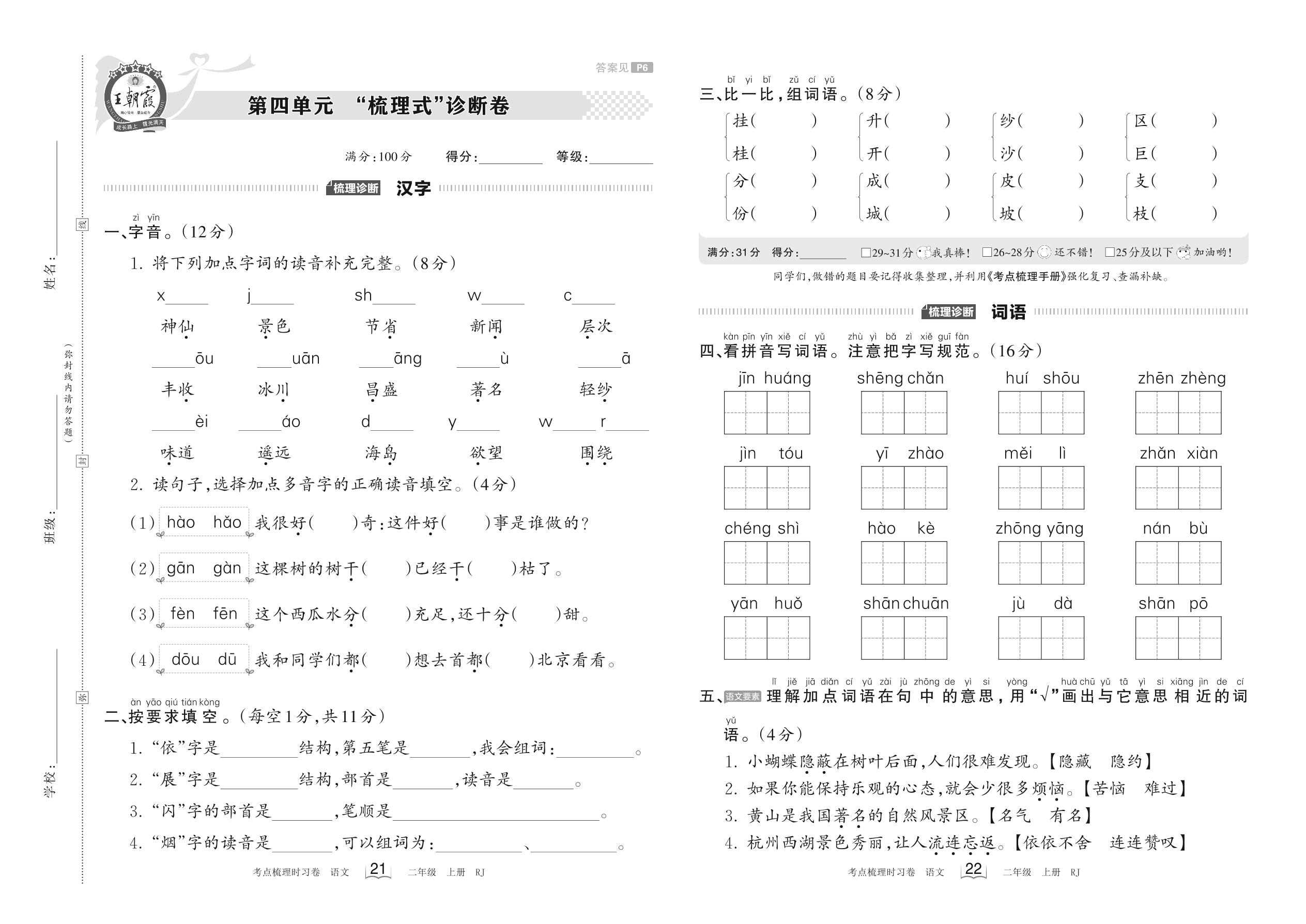 2023上册二年级语文人教版 第四单元 “梳理式”诊断卷