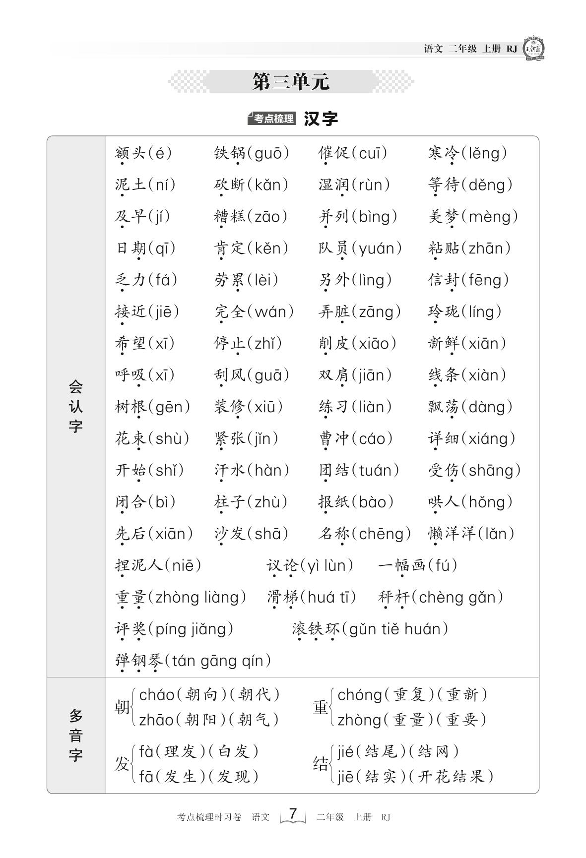 2023上册二年级语文人教版 考点梳理手册——第三单元