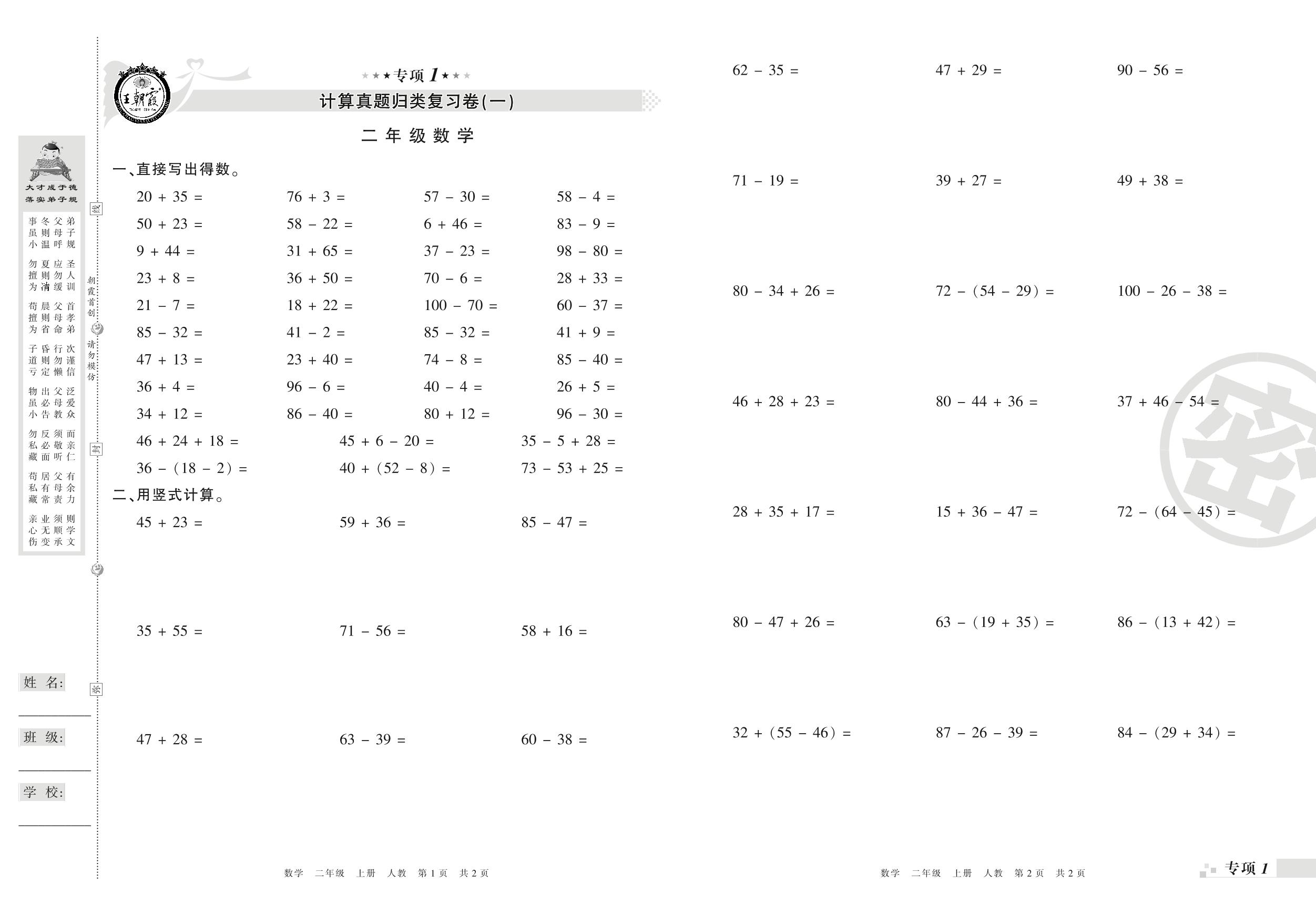 王朝霞期末专项卷——计算真题归类复习二年级上册数学(人教版)_R21080393118【0】