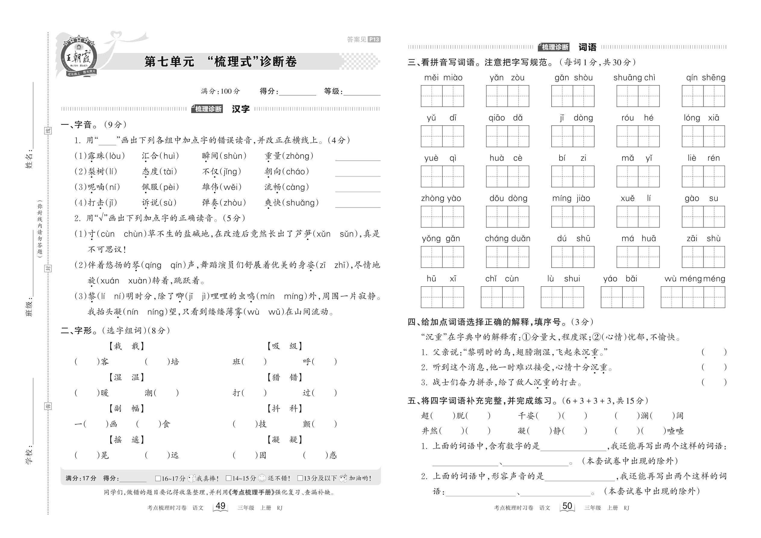2023上册三年级语文人教版 第七单元 “梳理式”诊断卷