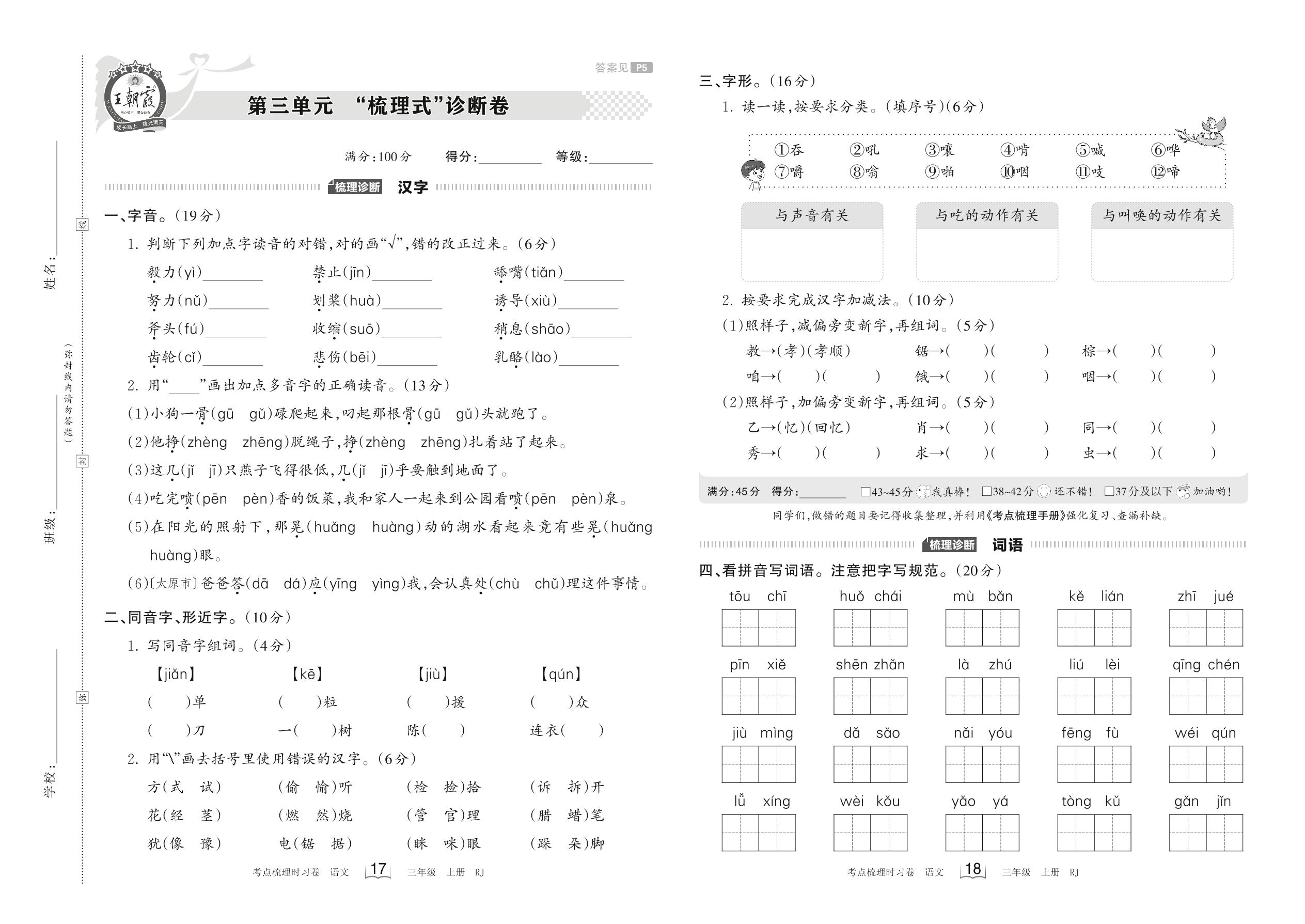 2023上册三年级语文人教版 第三单元 “梳理式”诊断卷