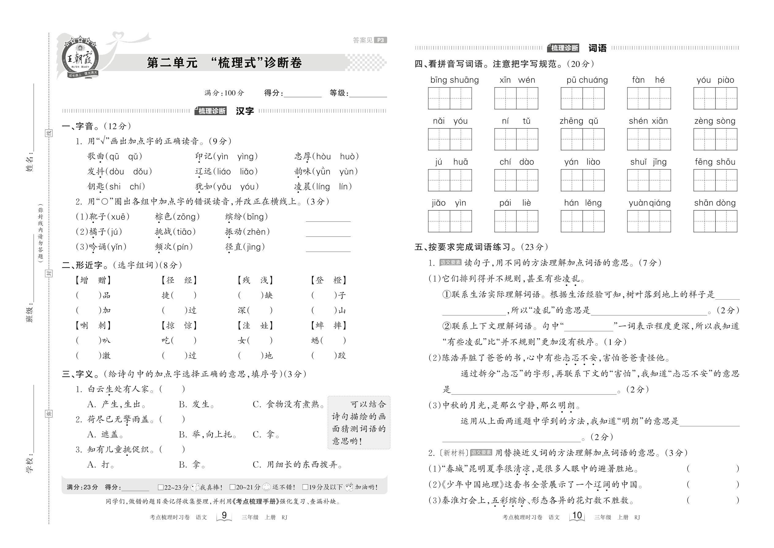2023上册三年级语文人教版 第二单元 “梳理式”诊断卷