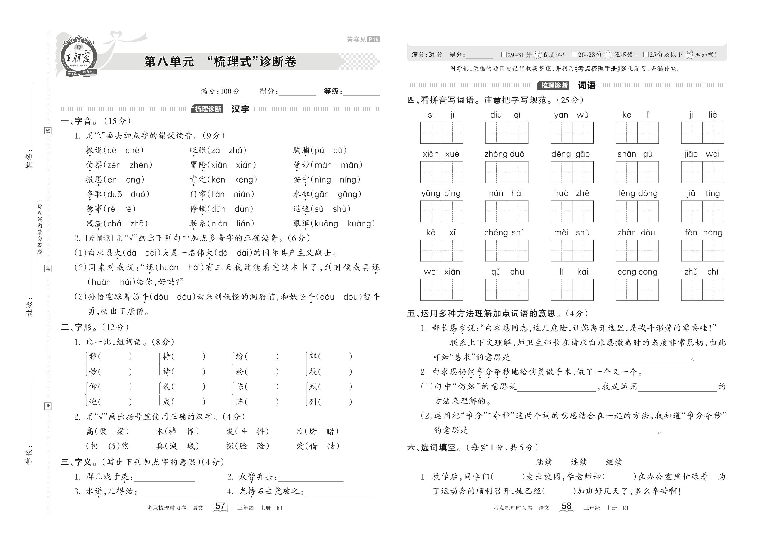 2023上册三年级语文人教版 第八单元 “梳理式”诊断卷