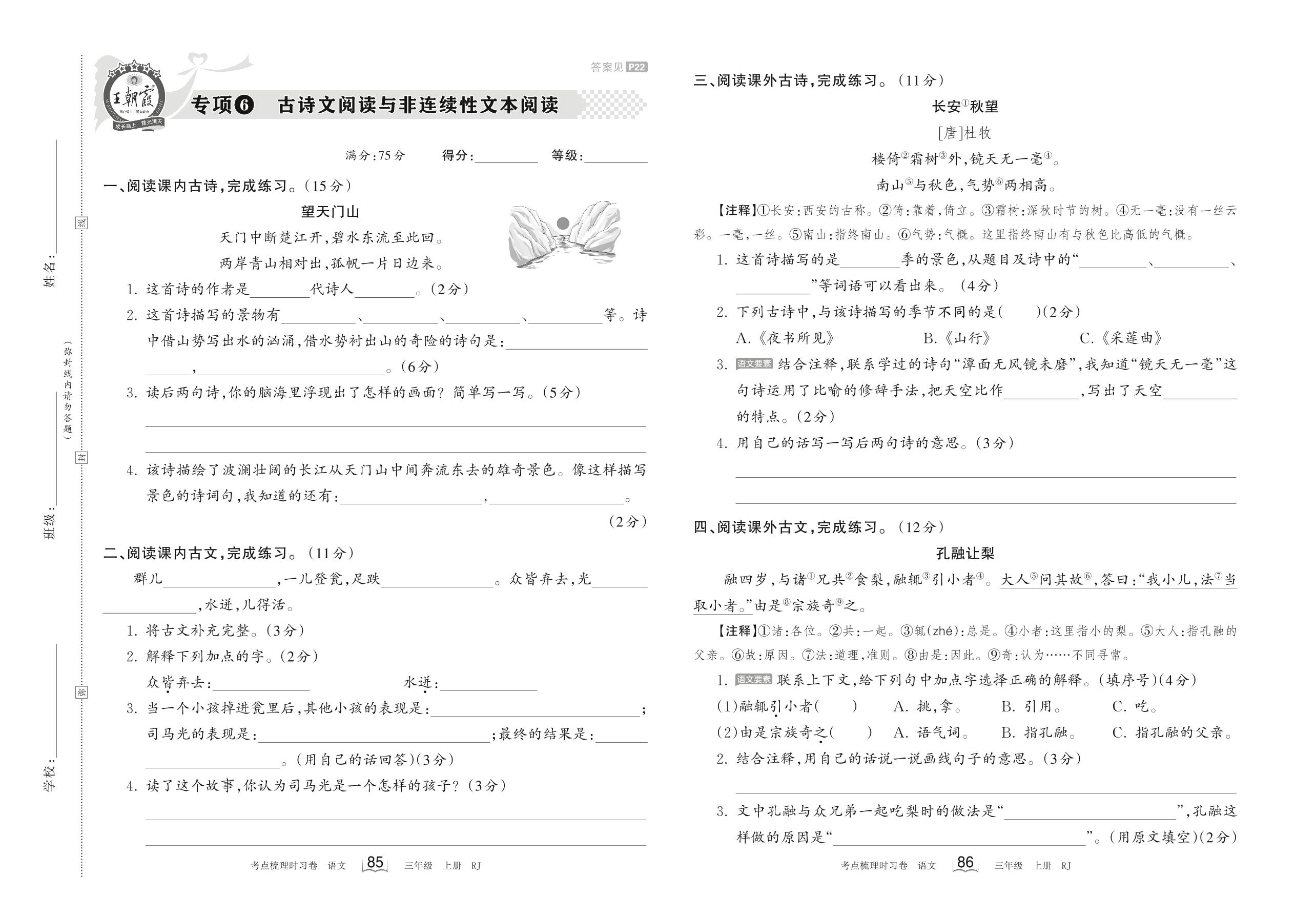 2023上册三年级语文人教版 专项6 古诗文阅读与非连续性文本阅读