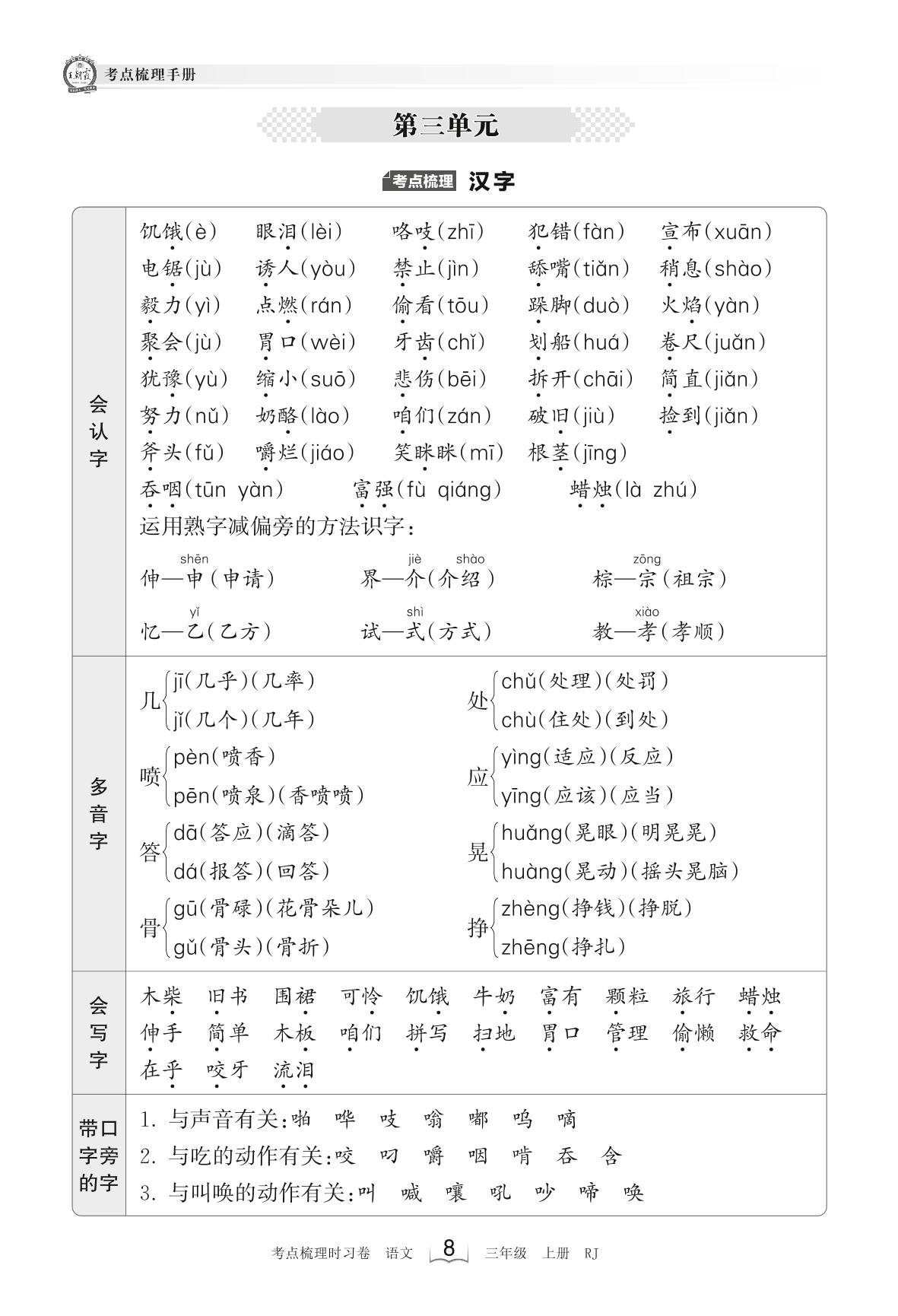 2023上册三年级语文人教版 考点梳理手册——第三单元