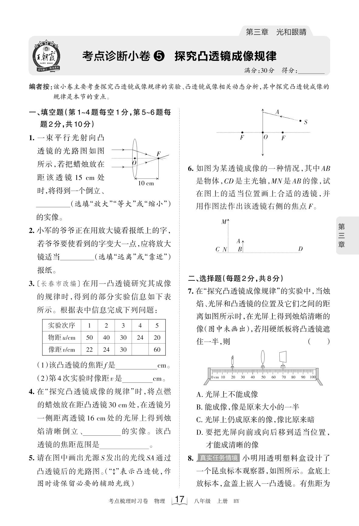 2023上册八年级物理沪粤版 第三章 考点诊断小卷5 探究凸透镜成像规律