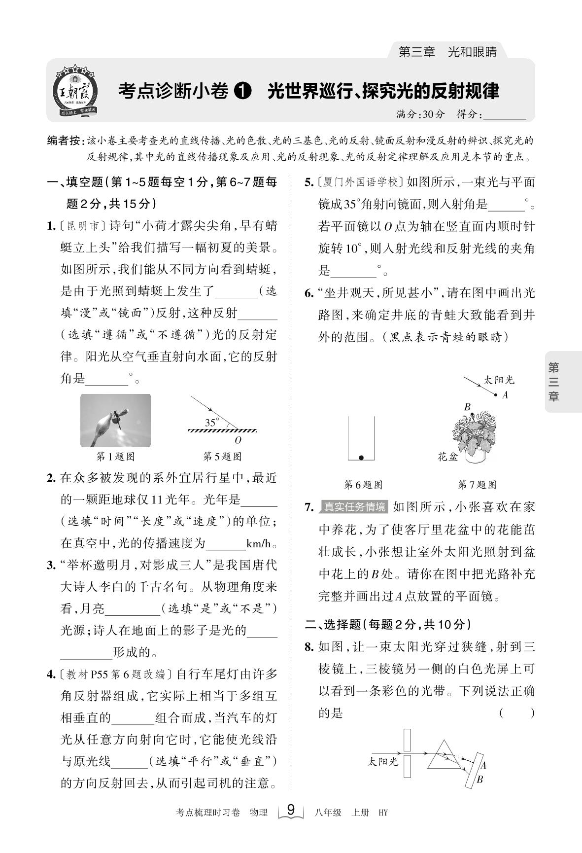 2023上册八年级物理沪粤版 第三章 考点诊断小卷1 光世界巡行、探究光的反射规律