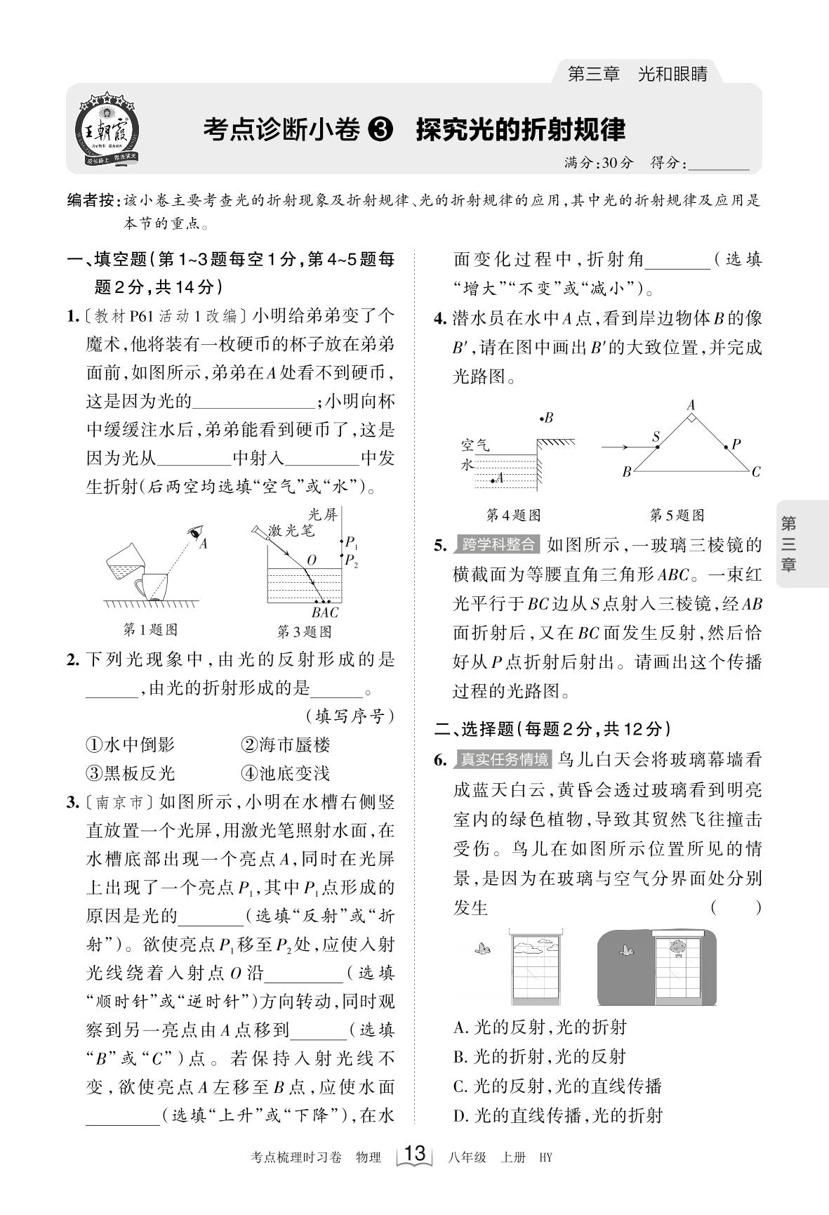 2023上册八年级物理沪粤版 第三章 考点诊断小卷3 探究光的折射规律