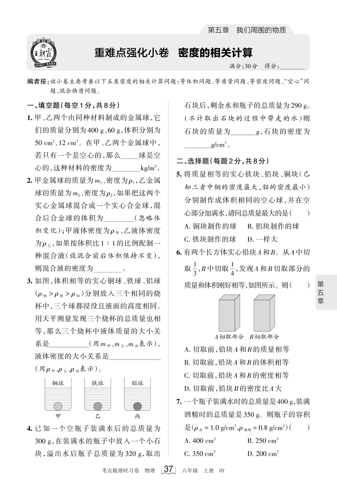2023上册八年级物理沪粤版 第五章 重难点强化小卷 密度的相关计算