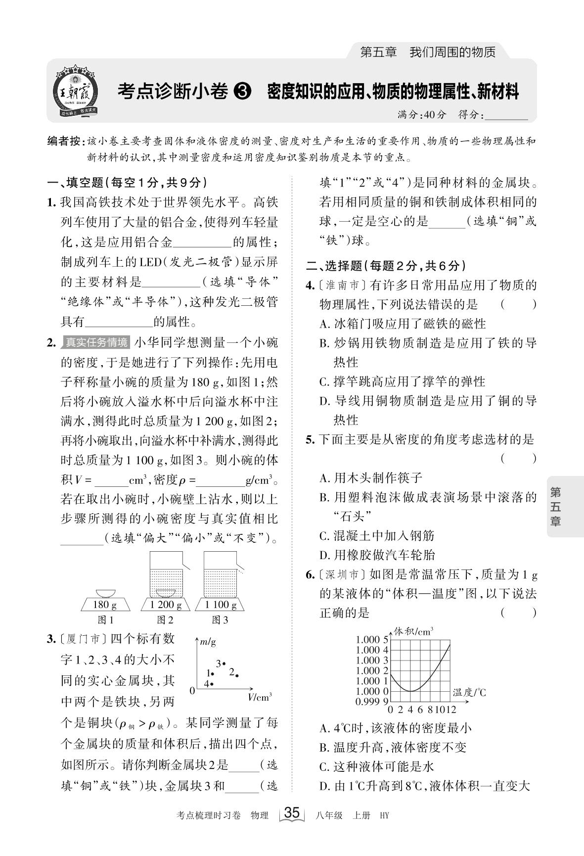 2023上册八年级物理沪粤版 第五章 考点诊断小卷3 密度知识的应用、物质的物理属性、新材料