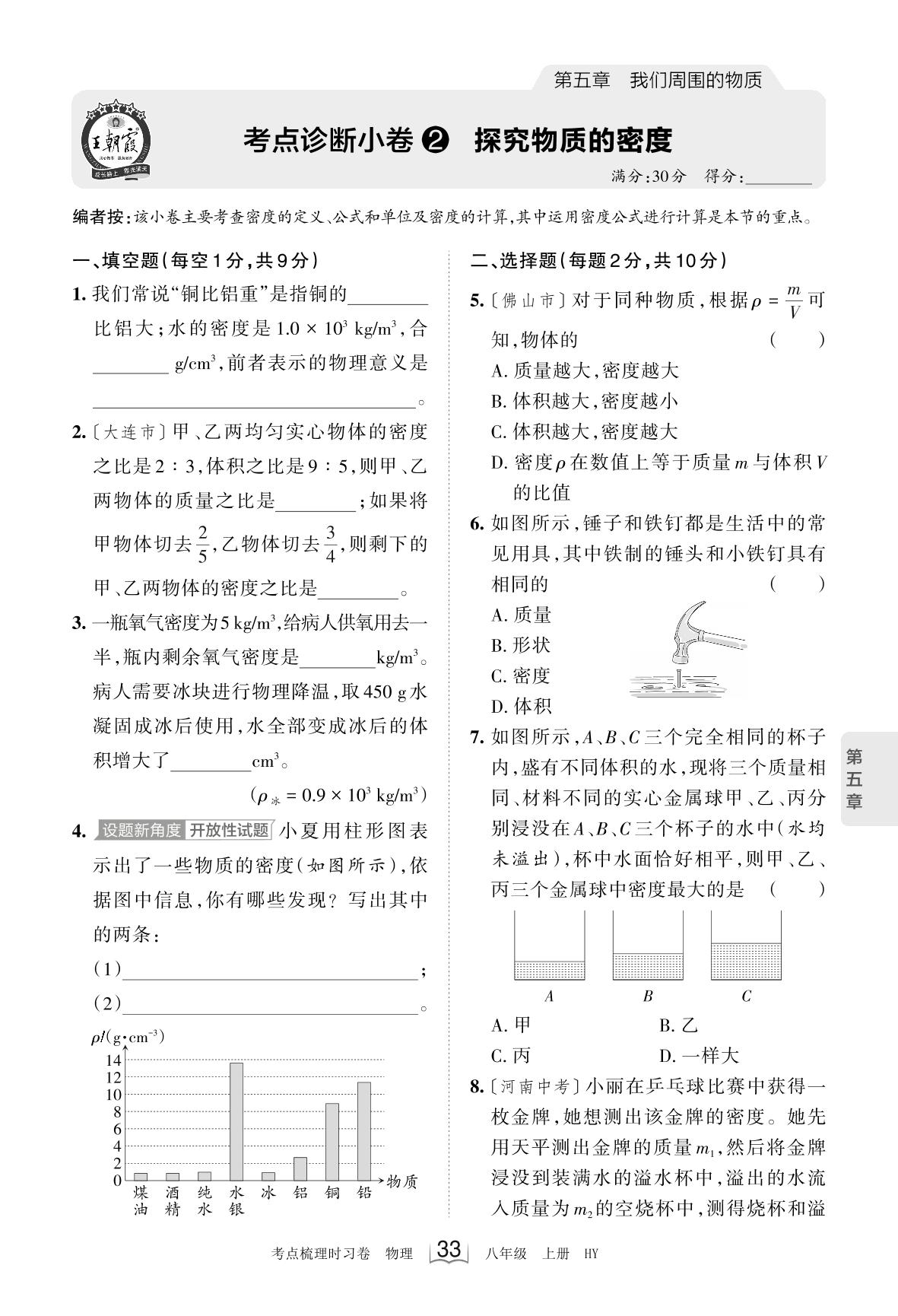2023上册八年级物理沪粤版 第五章 考点诊断小卷2 探究物质的密度
