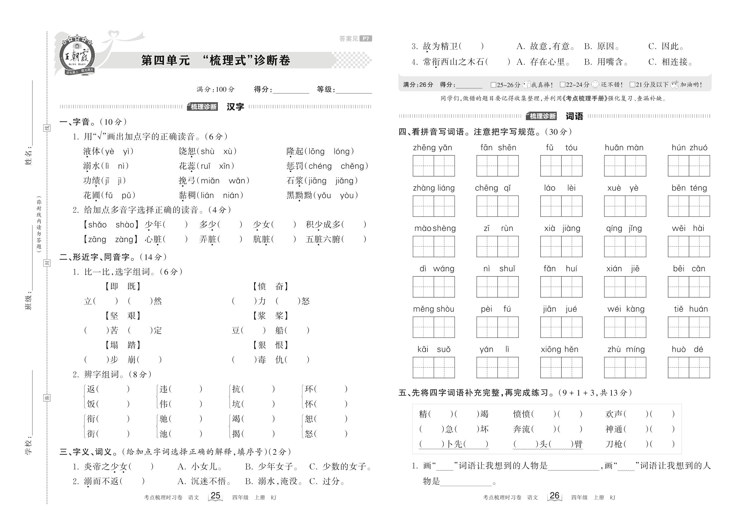 2023上册四年级语文人教版 第四单元 “梳理式”诊断卷