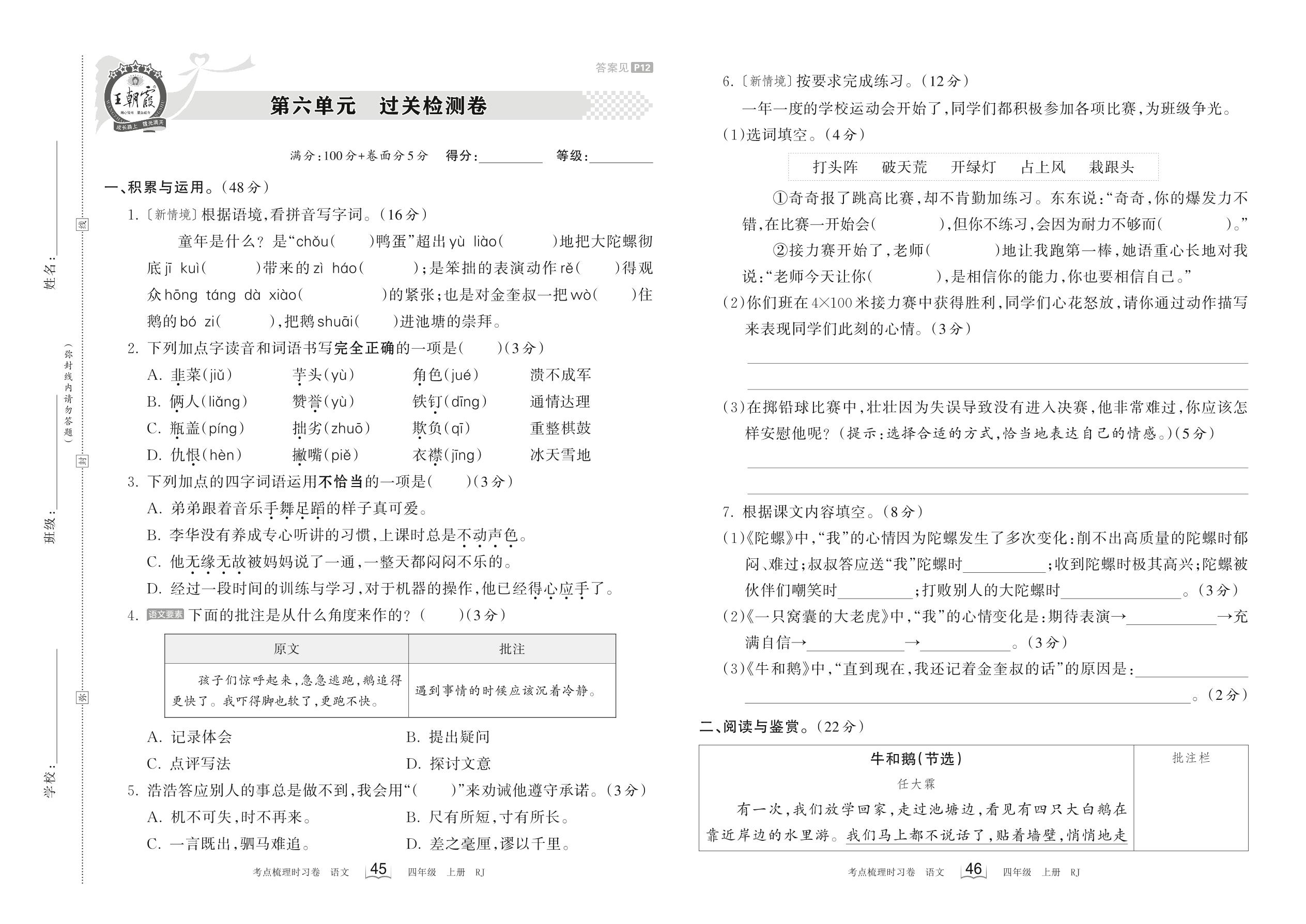 2023上册四年级语文人教版 第六单元 过关检测卷