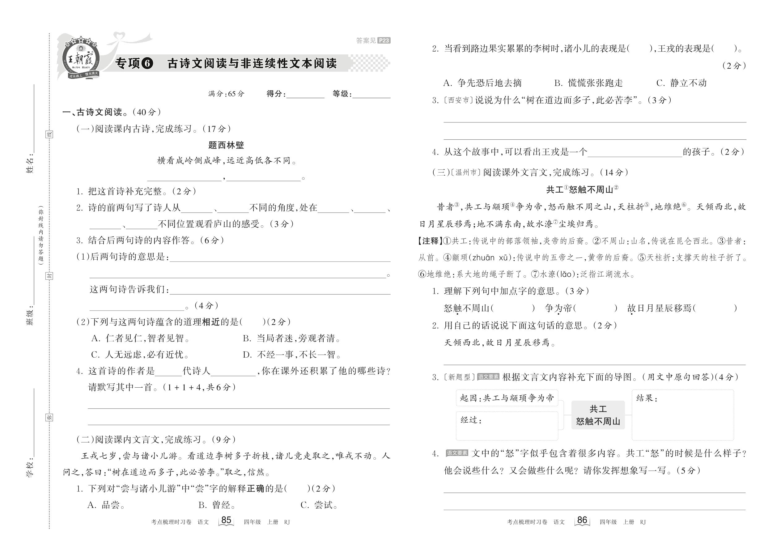 2023上册四年级语文人教版 专项6 古诗文阅读与非连续性文本阅读