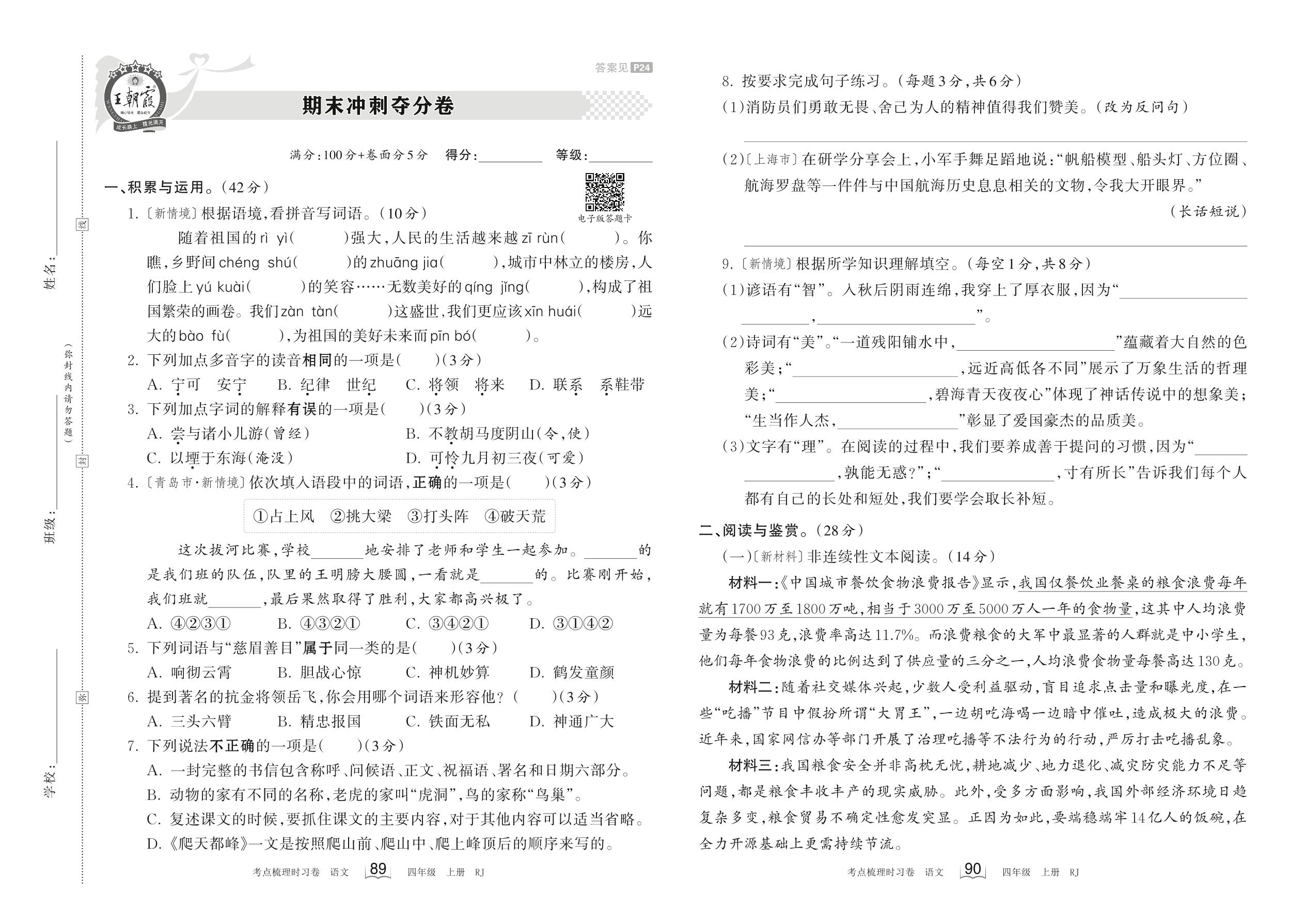 2023上册四年级语文人教版 期末冲刺夺分卷