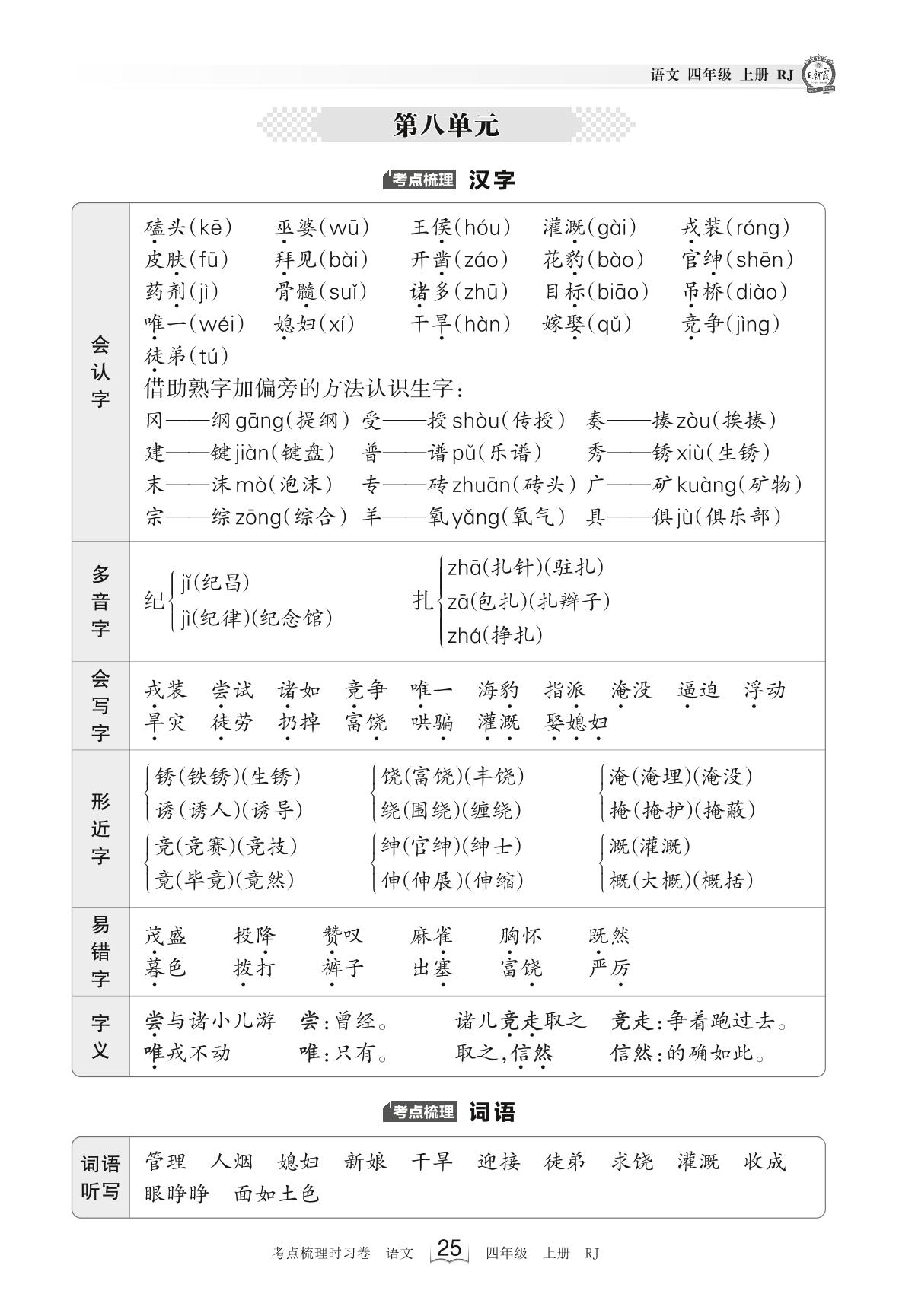 2023上册四年级语文人教版 考点梳理手册——第八单元