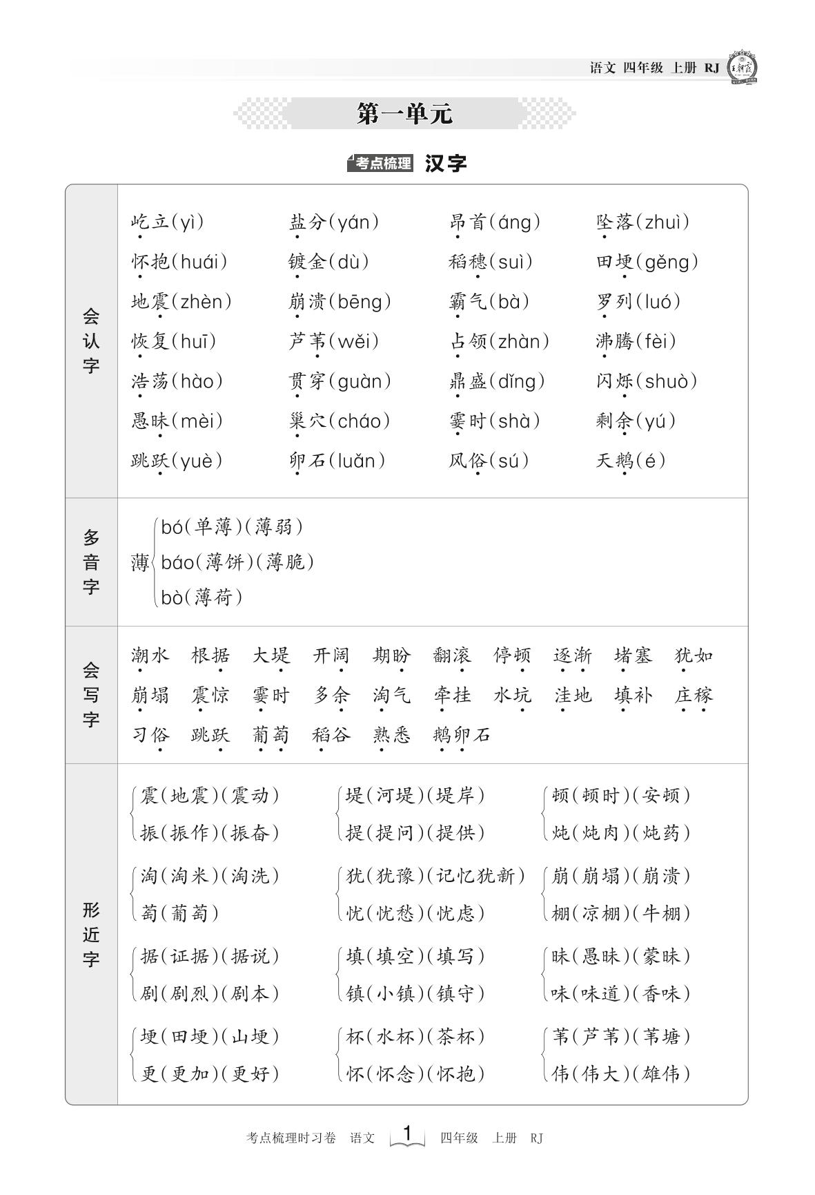 2023上册四年级语文人教版 考点梳理手册——第一单元