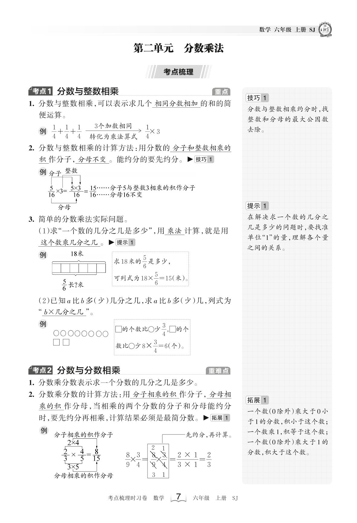 2023上册六年级数学苏教版 考点梳理手册——第二单元 分数乘法