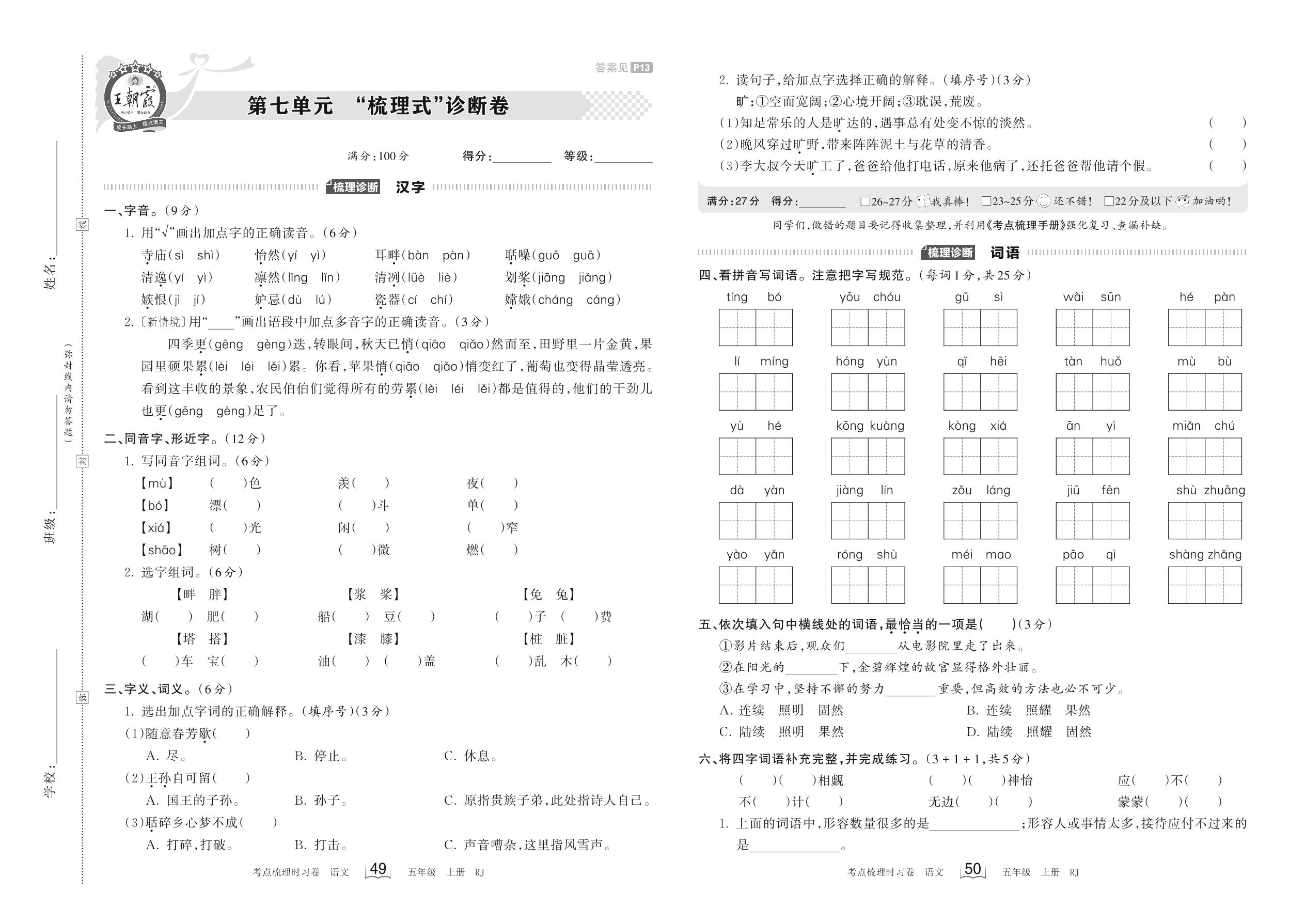 2023上册五年级语文人教版 第七单元 “梳理式”诊断卷