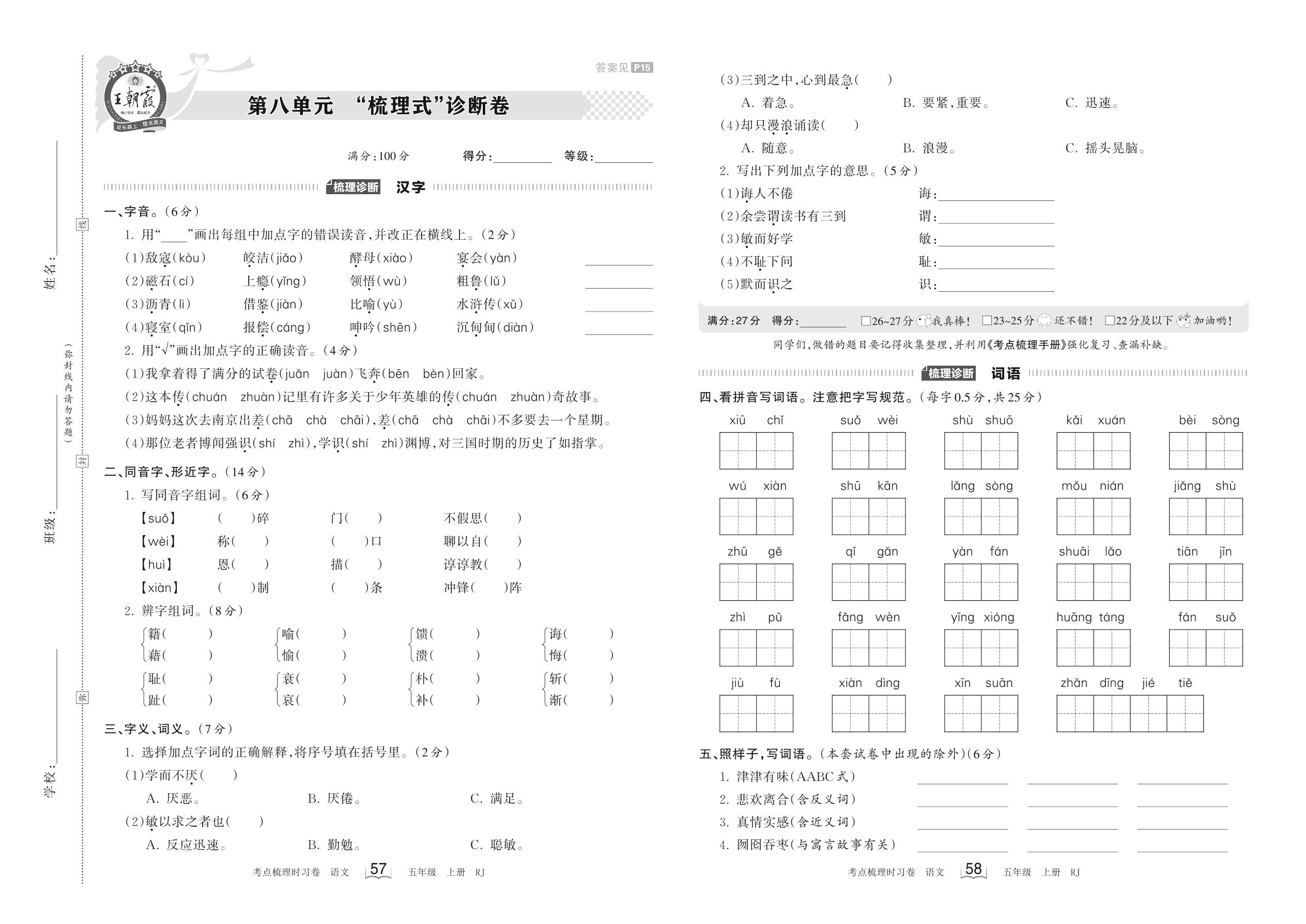 2023上册五年级语文人教版 第八单元 “梳理式”诊断卷