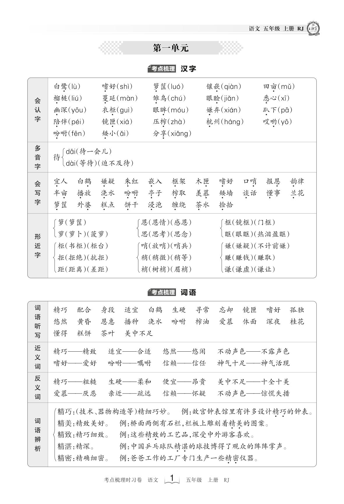 2023上册五年级语文人教版 考点梳理手册——第一单元