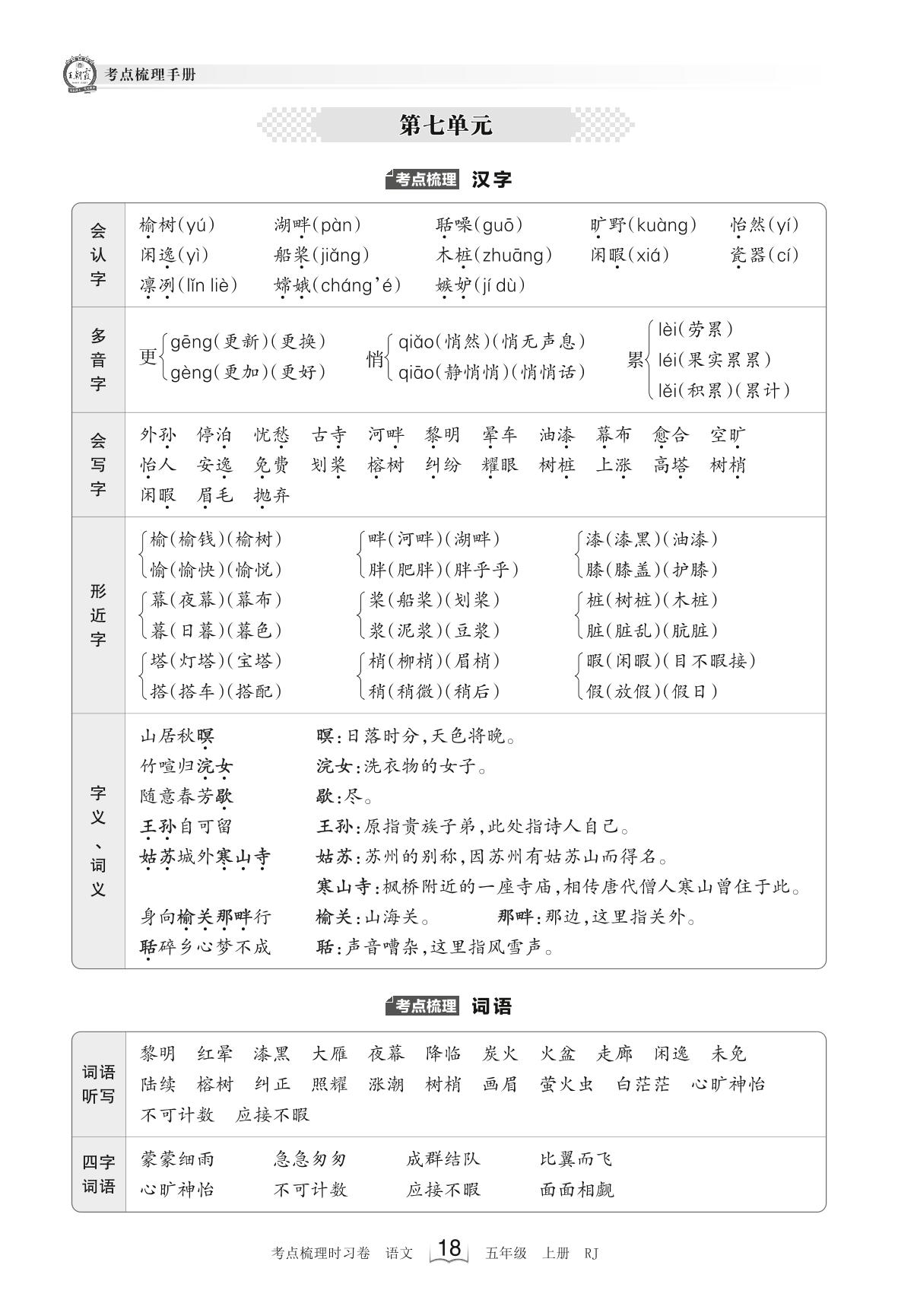 2023上册五年级语文人教版 考点梳理手册——第七单元