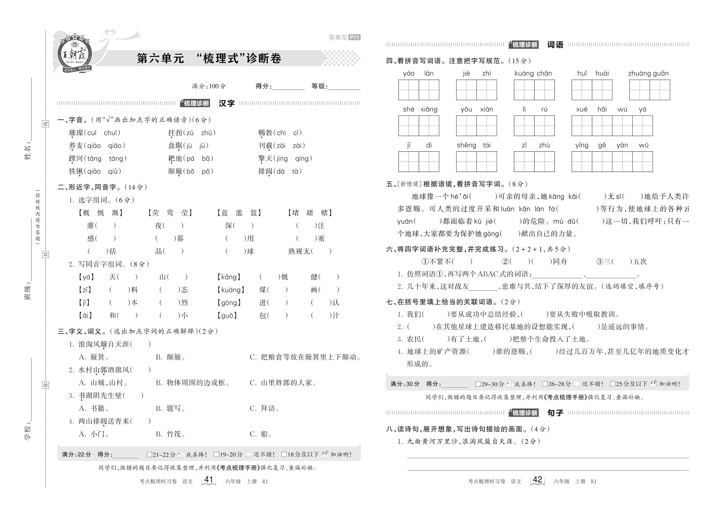 2023上册六年级语文人教版 第六单元 “梳理式”诊断卷