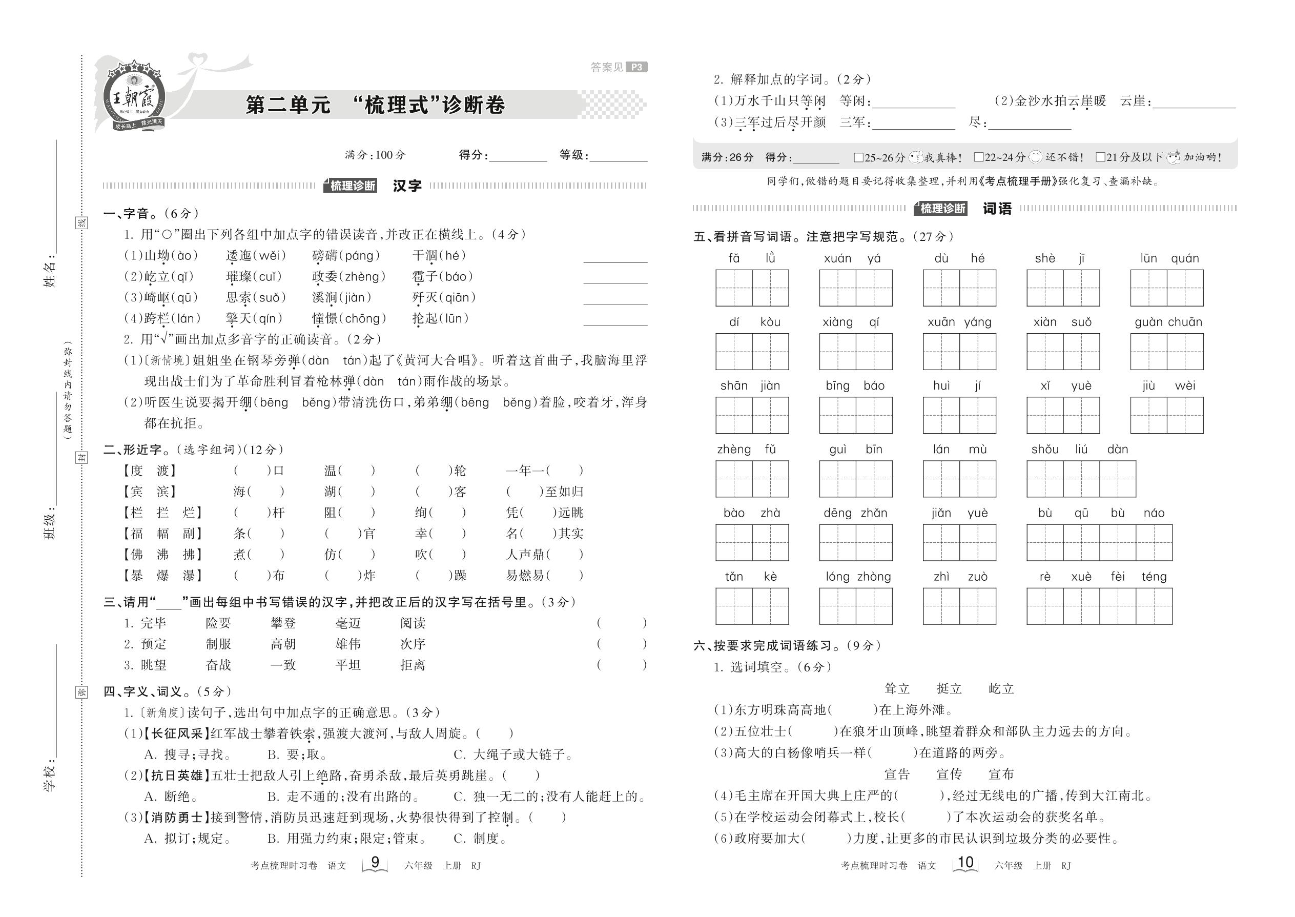 2023上册六年级语文人教版 第二单元 “梳理式”诊断卷