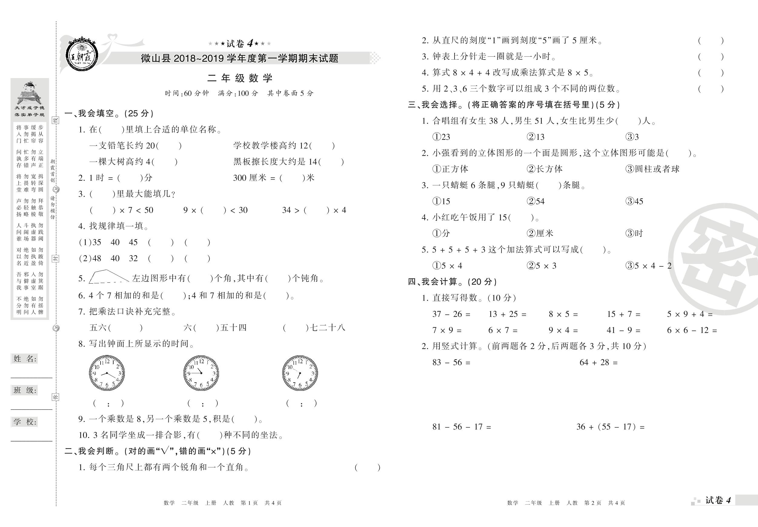 2018-2019学年第一学期济宁市微山县二年级数学试卷(人教版)【4】