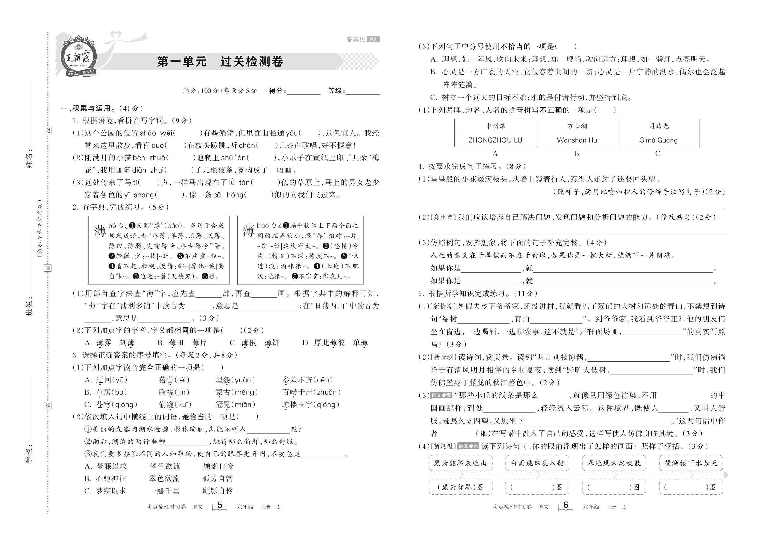 2023上册六年级语文人教版 第一单元 过关检测卷