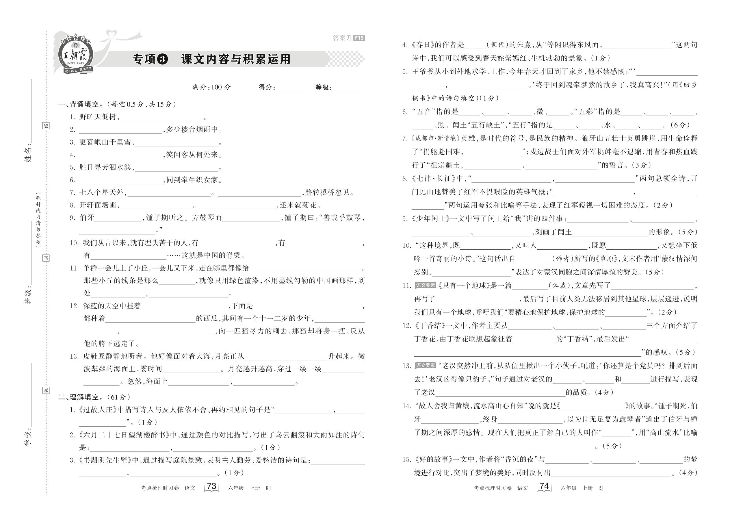 2023上册六年级语文人教版 专项3 课文内容与积累运用