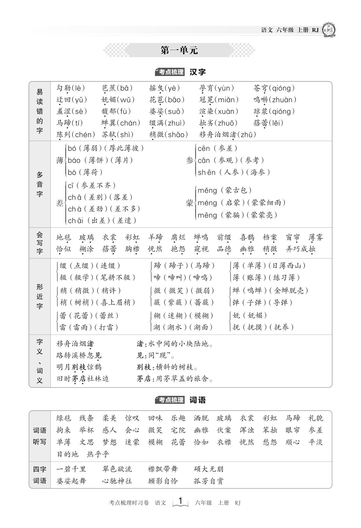 2023上册六年级语文人教版 考点梳理手册——第一单元