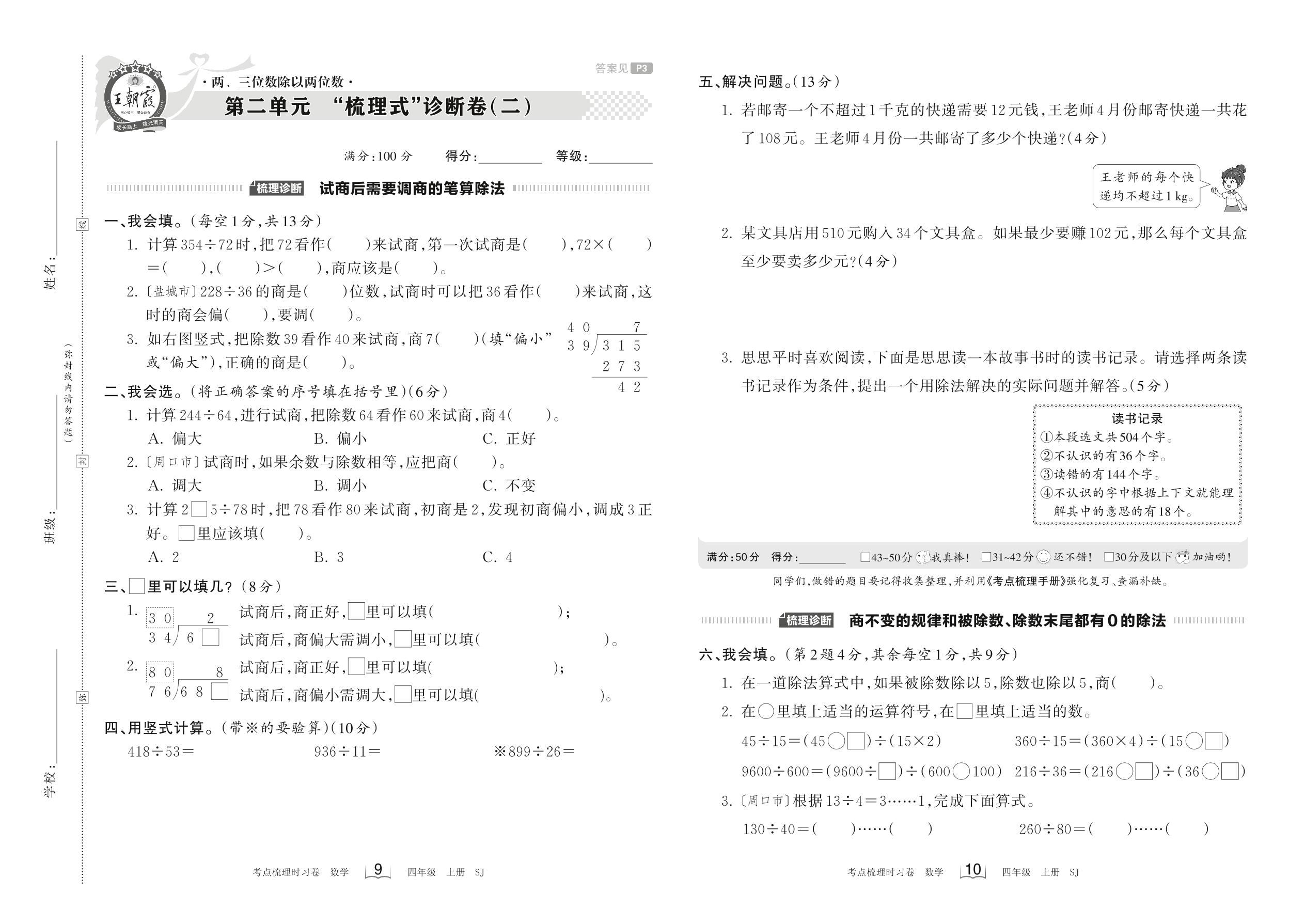 2023上册四年级数学苏教版 第二单元 “梳理式”诊断卷(二)