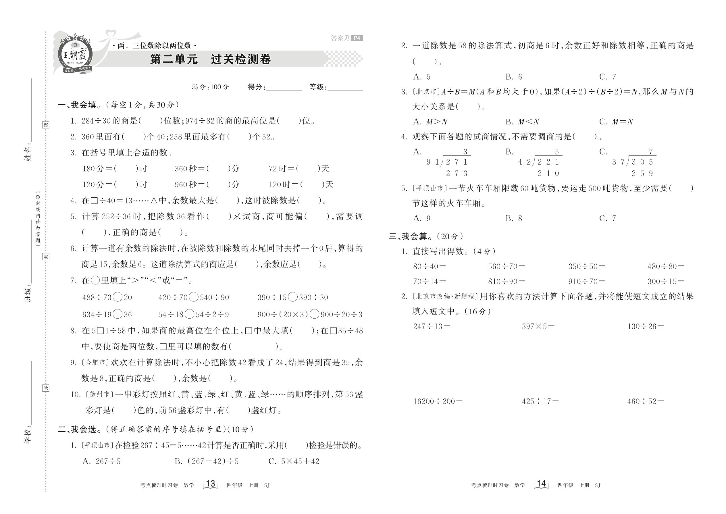 四年级数学苏教版上册单元卷