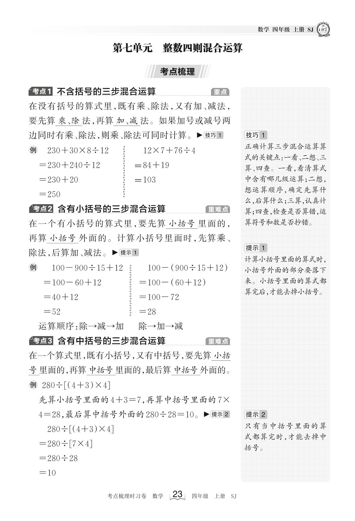 2023上册四年级数学苏教版 考点梳理手册——第七单元 整数四则混合运算