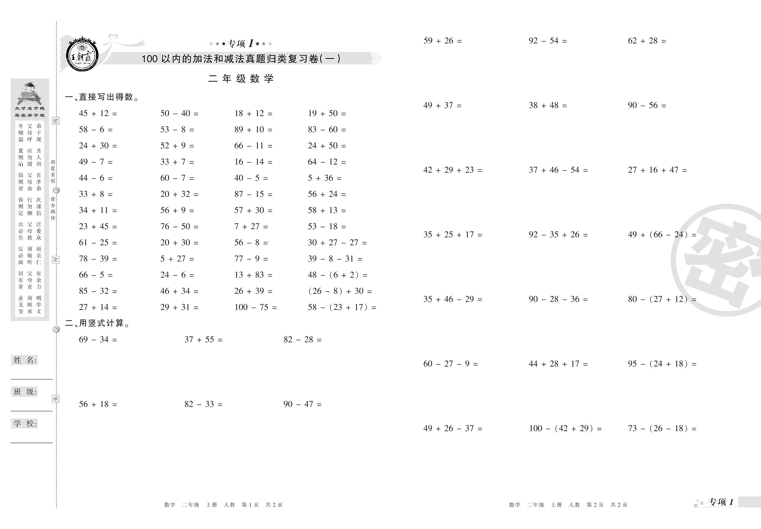 王朝霞期末专项卷——100以内的加法和减法真题归类复习二年级上册数学(人教版)_R21080393329【0】