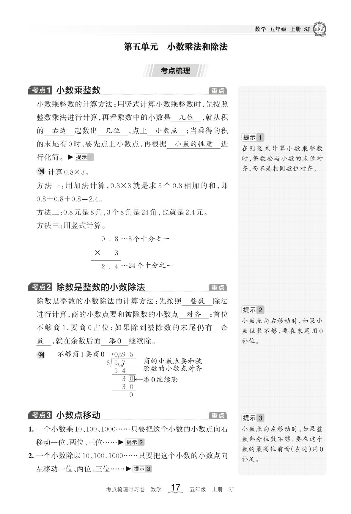 2023上册五年级数学苏教版 考点梳理手册——第五单元 小数的乘法和除法