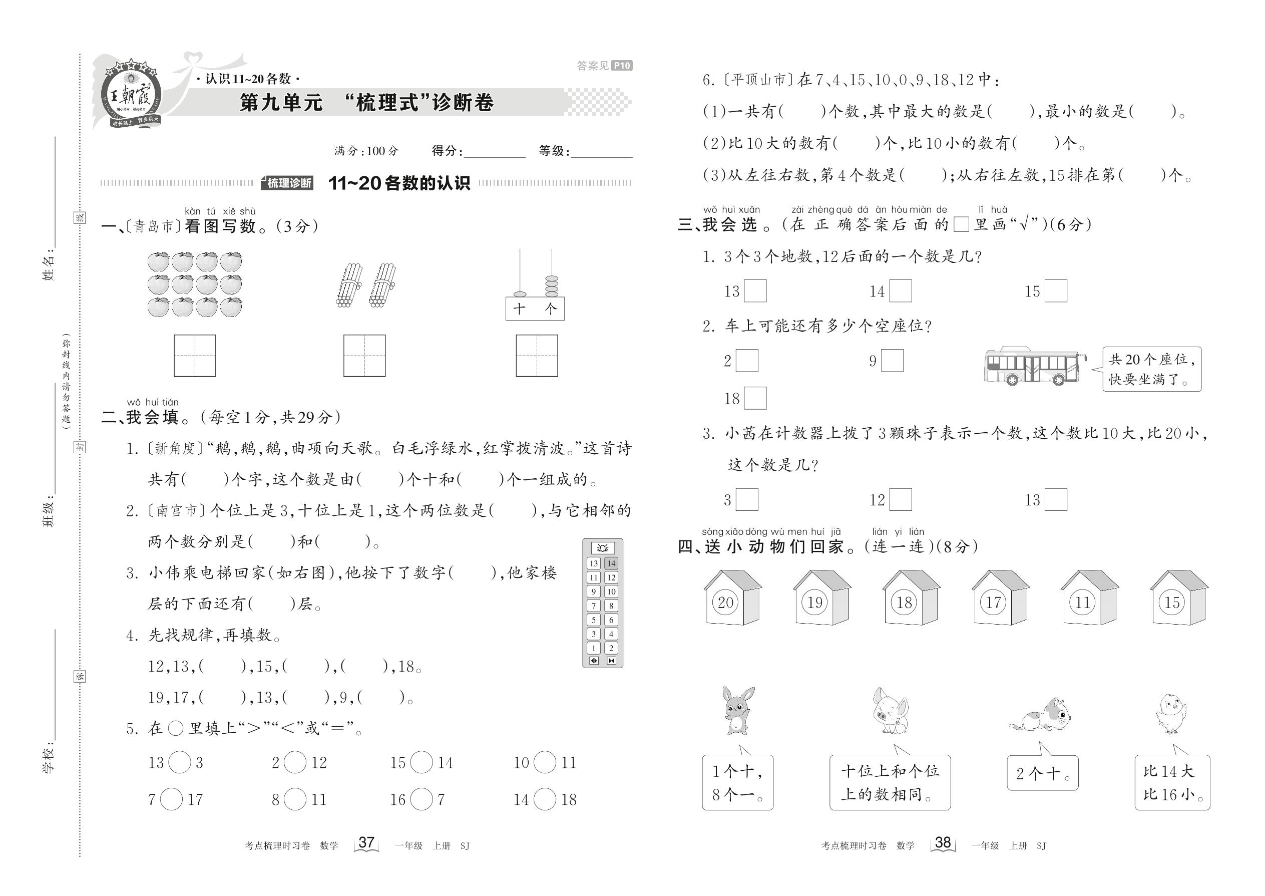 2023上册一年级数学苏教版 第九单元 “梳理式”诊断卷